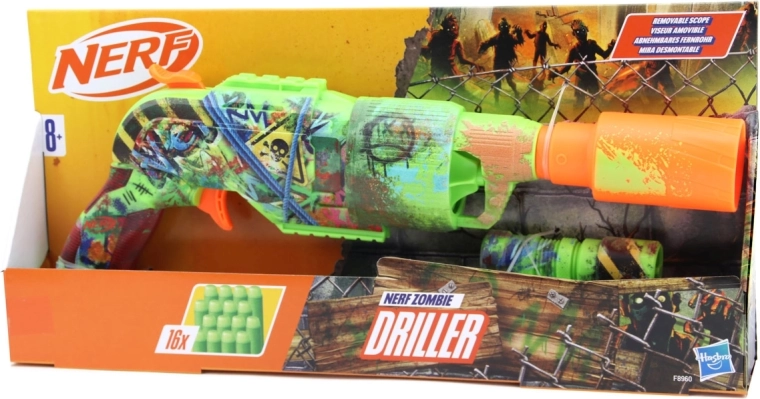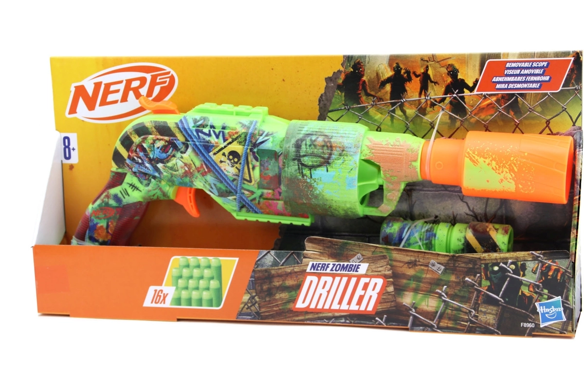 Entrez dans l’univers de l’action zombie avec le Nerf Zombie Driller, qui se distingue par son design graffiti accrocheur, son barillet rotatif de 5 fléchettes et ses nombreux accessoires, dont une lunette amovible. La boîte contient 16 fléchettes en mousse Nerf Elite, pour jouer plus longtemps sans recharger trop souvent. Idéal pour les enfants dès 8 ans, en intérieur comme en extérieur, sans piles.
