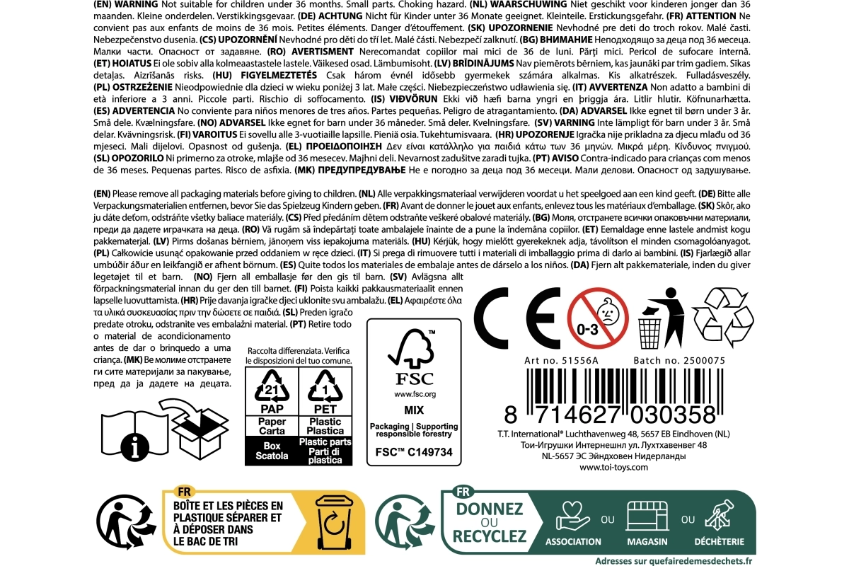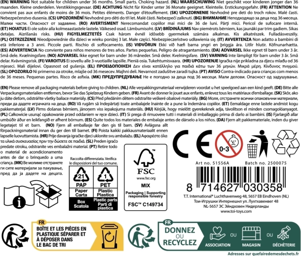 Dans la boîte, vous trouverez tout le nécessaire pour jouer : la base (tonneau), la tête du dinosaure, 16 bâtonnets de feu et une planche d’autocollants pour peaufiner les détails. Des pièces en plastique robustes aux bords arrondis conviennent aux petites mains des enfants. Le jeu développe la motricité, la patience et la vigilance et est parfait pour les soirées en famille ou les fêtes d’enfants.