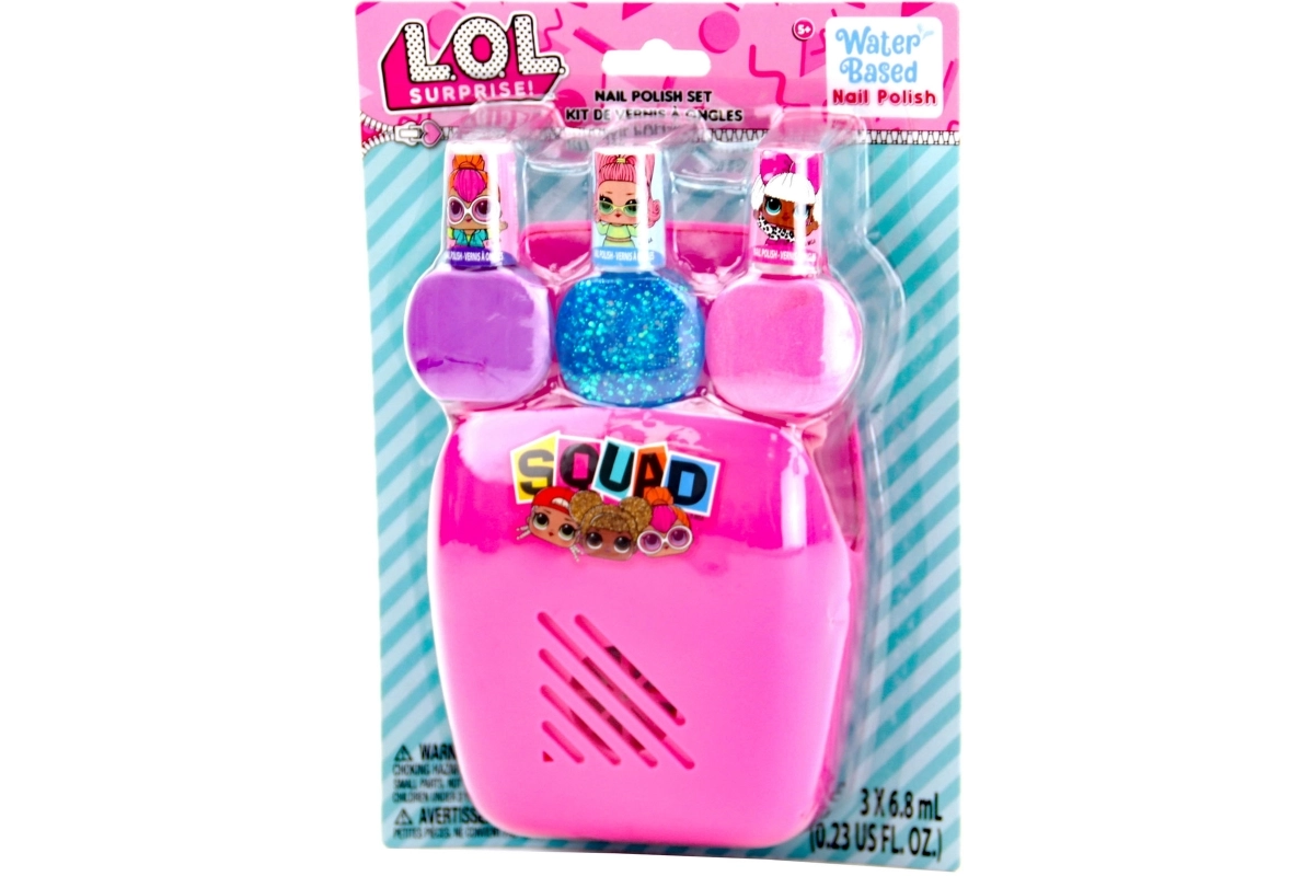 Coffret manucure stylé pour petites coquettes inspiré des poupées L.O.L.. Contient 3 vernis à ongles colorés et un souffleur à piles pour un séchage rapide (2× AA, non incluses). Idéal pour la décoration créative des ongles et les premières expériences cosmétiques.