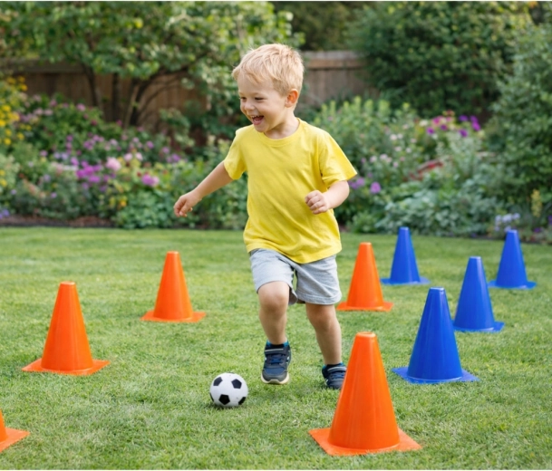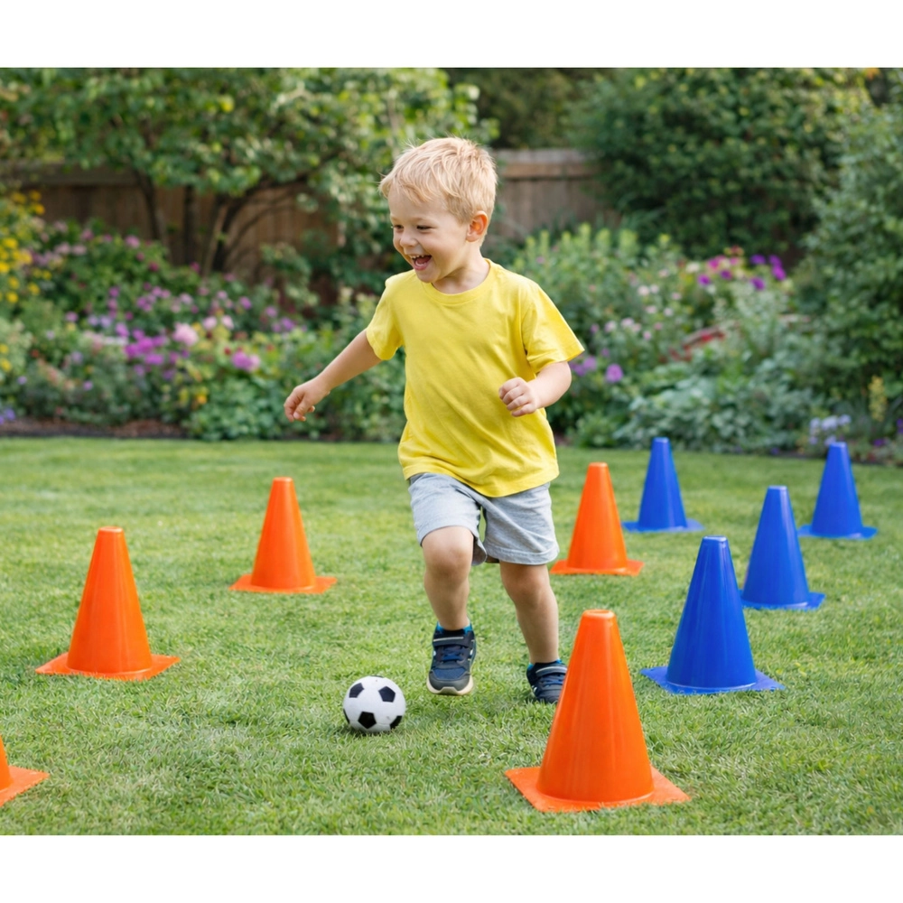 Les cônes de couleur orange et bleue, vives et contrastées, aident les enfants à mieux suivre le parcours et augmentent la sécurité de l’entraînement sur le terrain comme au jardin.