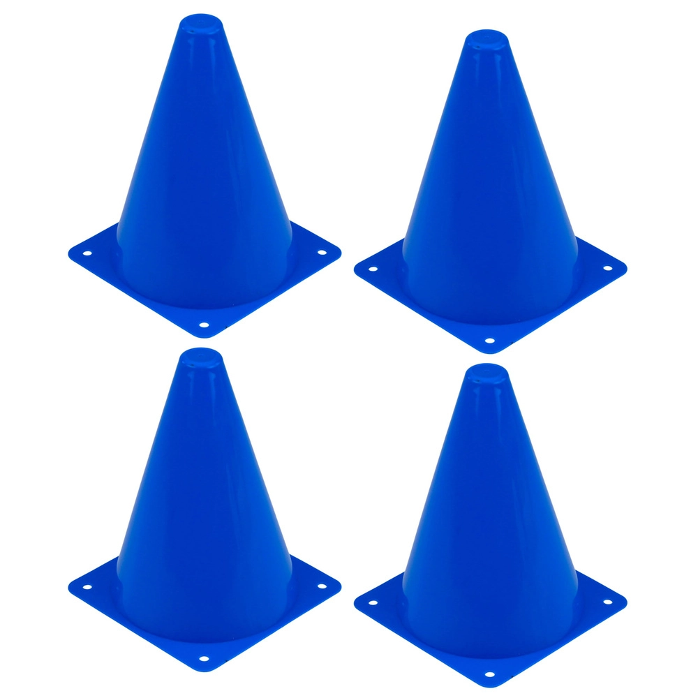 Les bases carrées avec des trous aux coins maintiennent les cônes fermement en place et permettent de les fixer avec des piquets par temps venteux ou sur terrain irrégulier.