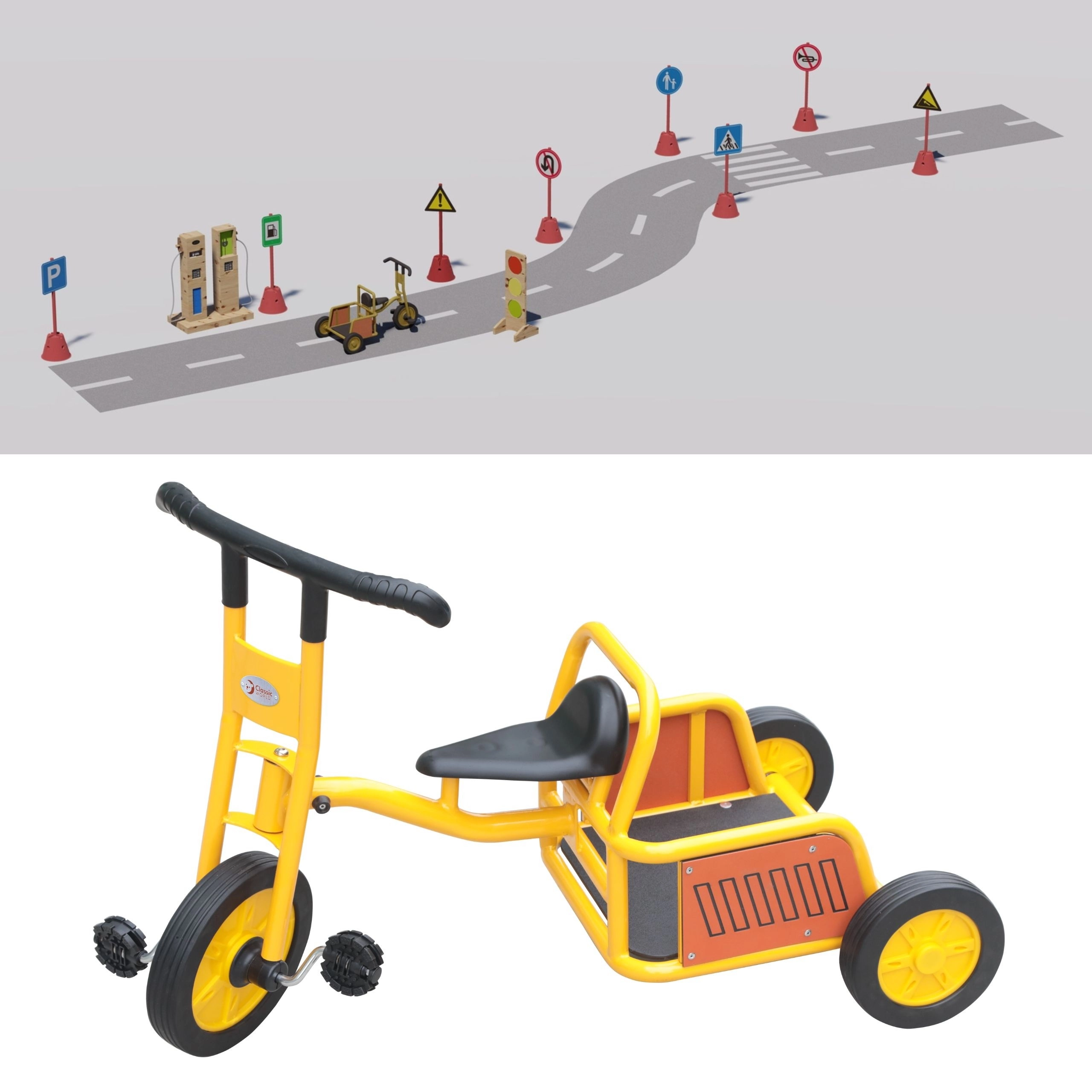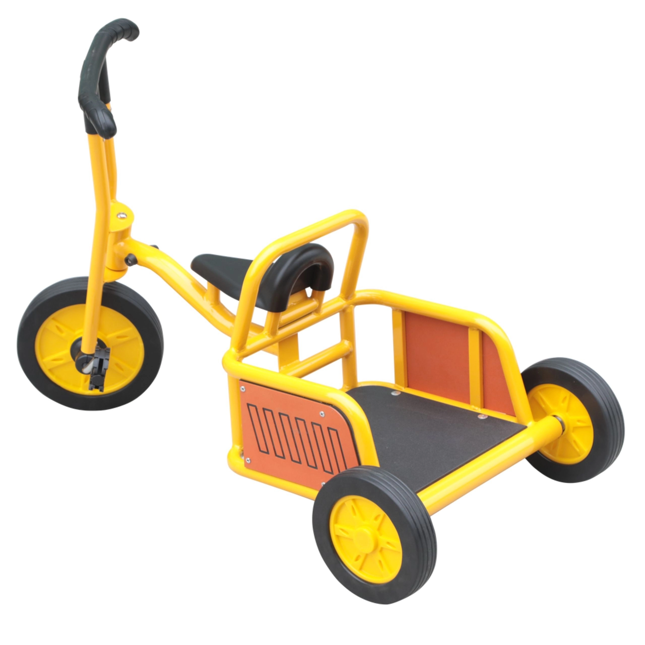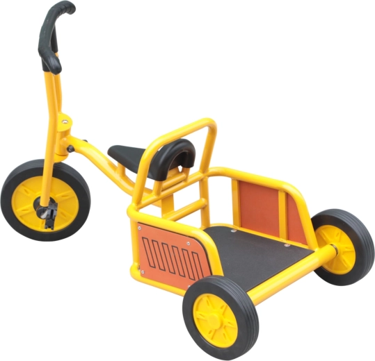 Ce tricycle robuste au jaune éclatant est conçu pour une conduite sûre et ludique. Grâce à son cadre métallique résistant, à ses poignées en caoutchouc et à ses roues larges à bonne adhérence, il supporte une utilisation quotidienne dans les écoles maternelles comme dans le jardin à la maison. Les enfants pédalent facilement et entraînent la force des jambes et la coordination.