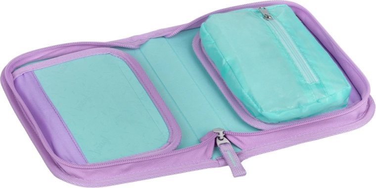 Deux rabats et un aménagement clair offrent un accès rapide à toutes les fournitures. Une fois ouverte, la trousse peut être entièrement dépliée pour une vue d’ensemble immédiate.