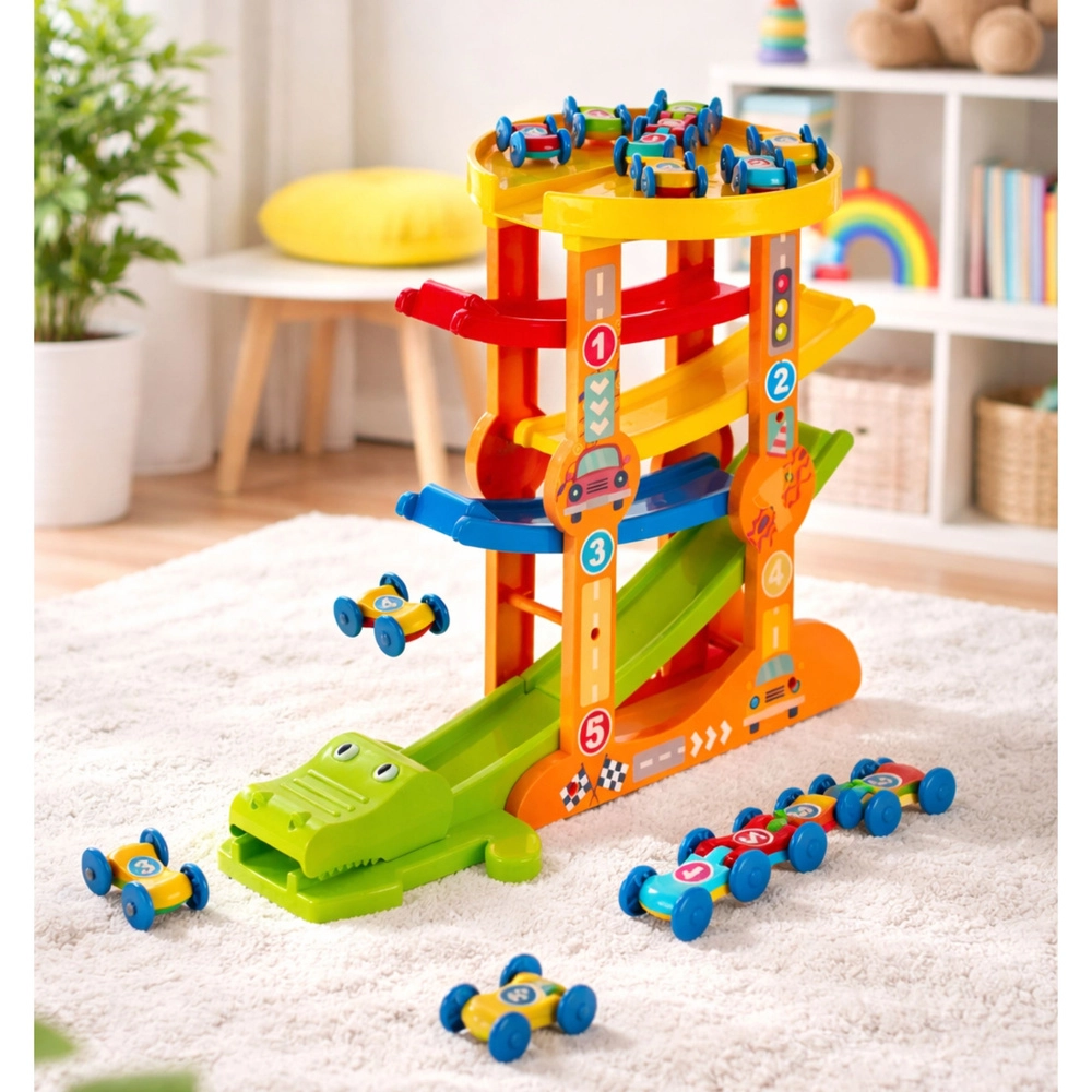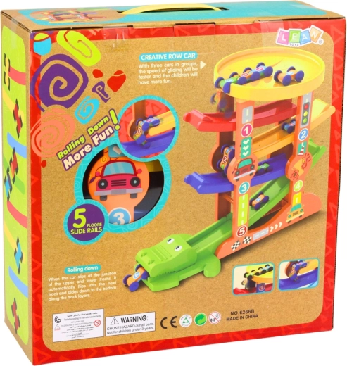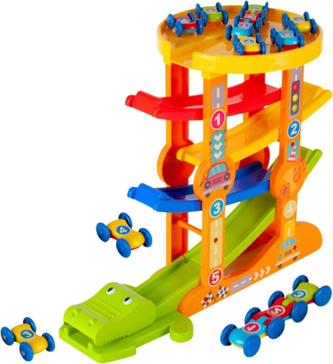 - Piste à 5 niveaux avec catapulte crocodile, 5 petites voitures bicolores, petit train de voitures reliées, autocollants avec chiffres, emballage coloré
