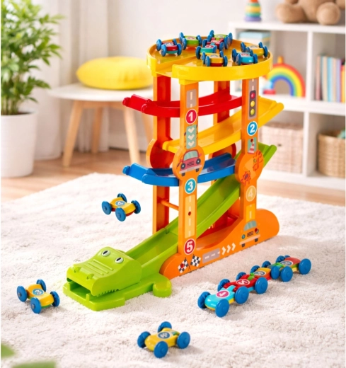 Amusant circuit automobile en forme de crocodile avec rampe catapulte intégrée, offrant aux enfants à la fois action et apprentissage. La petite voiture dévale 5 niveaux colorés et est propulsée par une catapulte à la fin, ce qui ouvre la gueule du crocodile. Le jouet favorise la compréhension du mouvement et de la gravité, développe la motricité fine, l’apprentissage des couleurs et des chiffres et offre une conception stable et sûre, idéale comme cadeau.