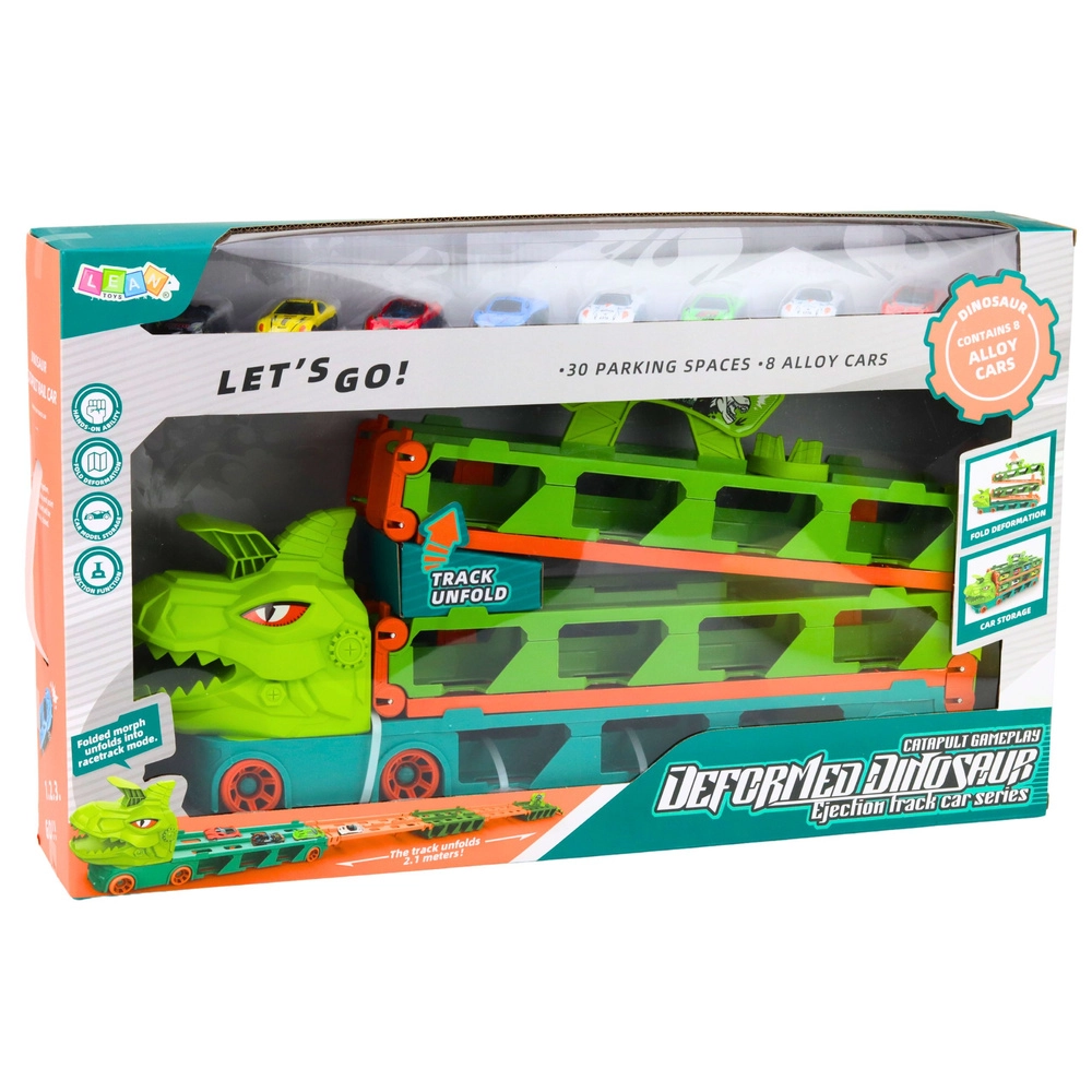 - Camion dinosaure avec fonction piste, 8 petites voitures, éléments de piste à assembler