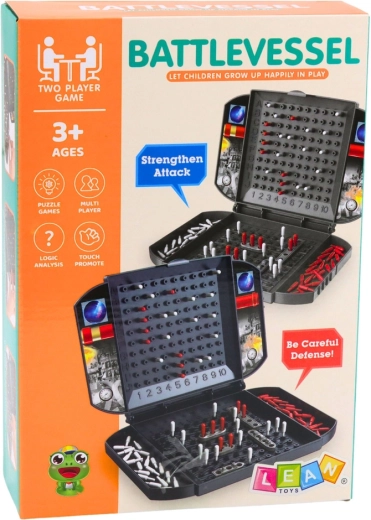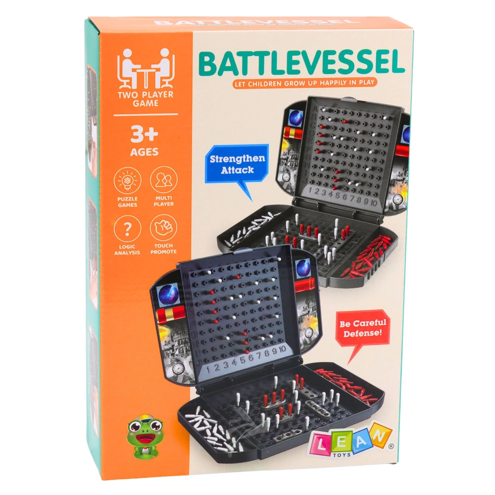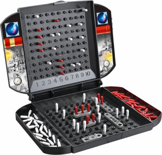 Déroulement du jeu : Les joueurs placent secrètement leurs navires sur une grille. Ils annoncent à tour de rôle des coordonnées ; une touche est marquée par un jeton « touché », une case vide par « à côté ». Gagne celui qui coule en premier tous les navires de l’adversaire.