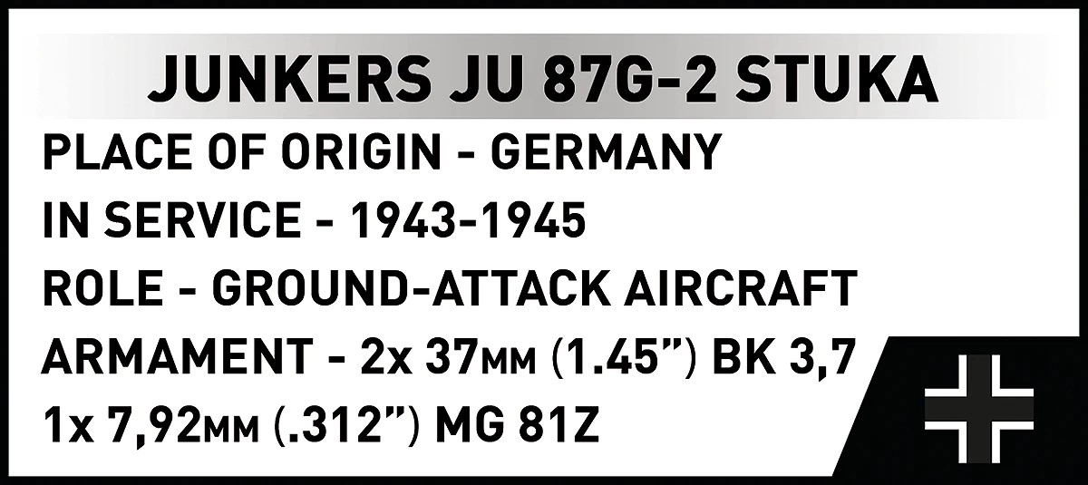 Silhouette fidèlement reproduite du Ju 87 G-2 avec ailes en « W », canons sous voilure et nouvelle verrière de cockpit. Idéal pour les passionnés d’histoire militaire et les collectionneurs.
