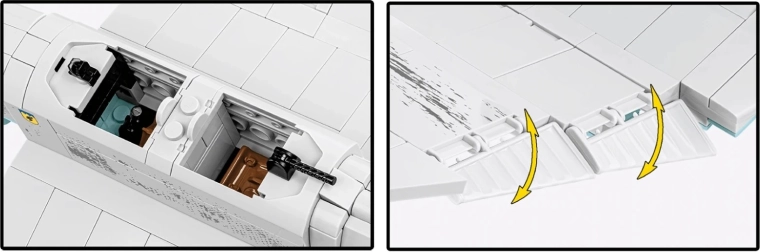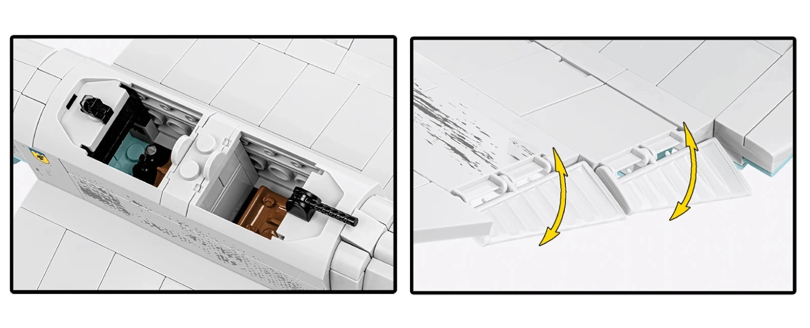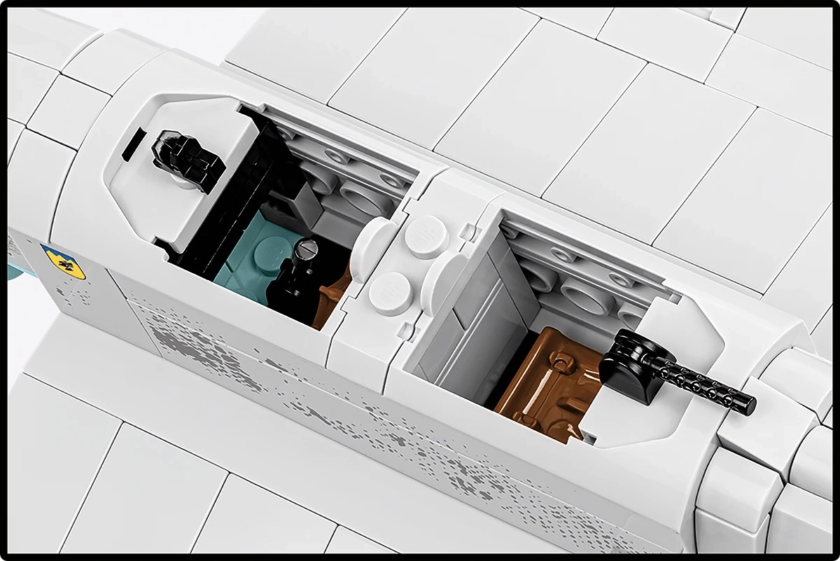 Le kit met l’accent sur le jeu et l’exposition : la canopée ouvrante permet d’installer les pilotes à l’intérieur, l’hélice tourne, les roues avec pneus en caoutchouc roulent en douceur et les gouvernes mobiles ajoutent du dynamisme. Un socle spécial avec le nom de l’appareil souligne l’aspect collection et permet une présentation « en vol ».