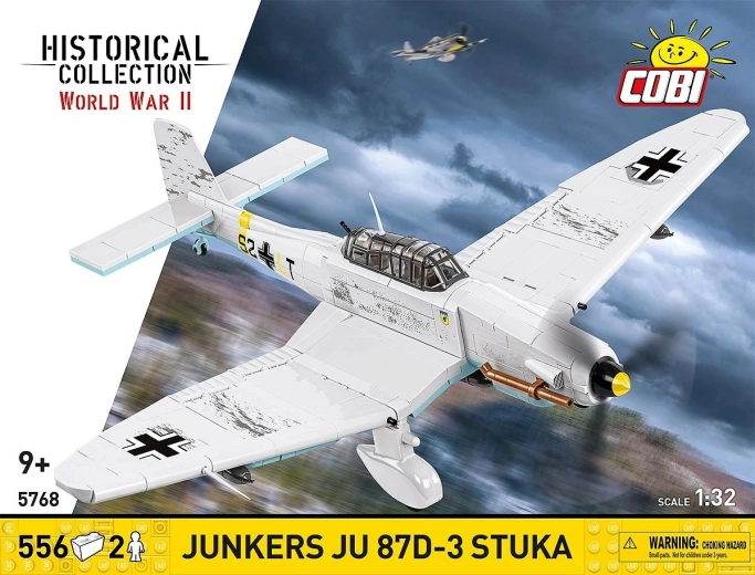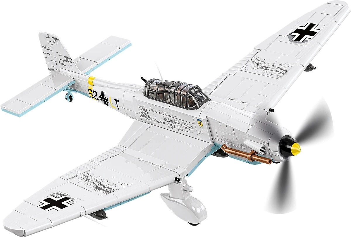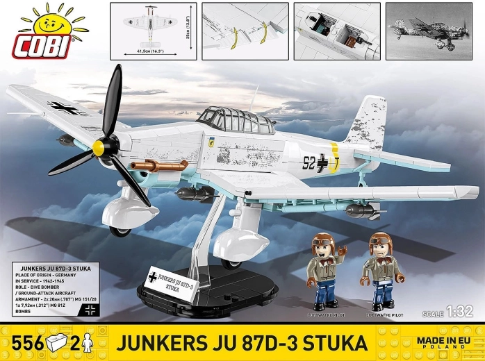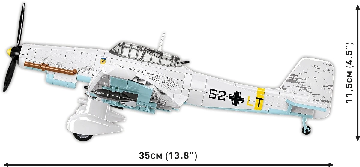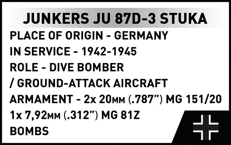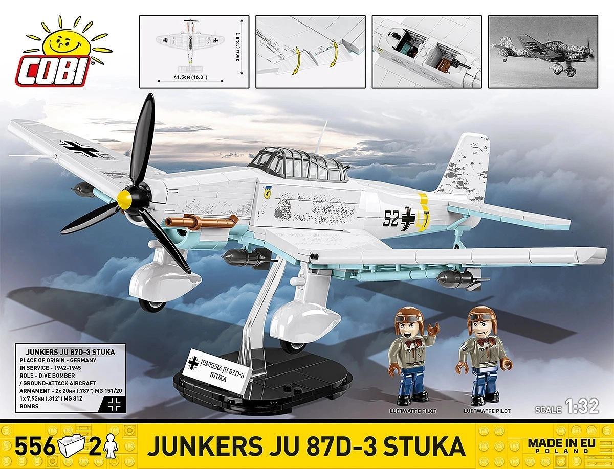 Comprend 2 minifigurines d’équipage et un socle noir avec l’inscription « Junkers Ju 87D-3 Stuka » pour exposer le modèle en « vol ».