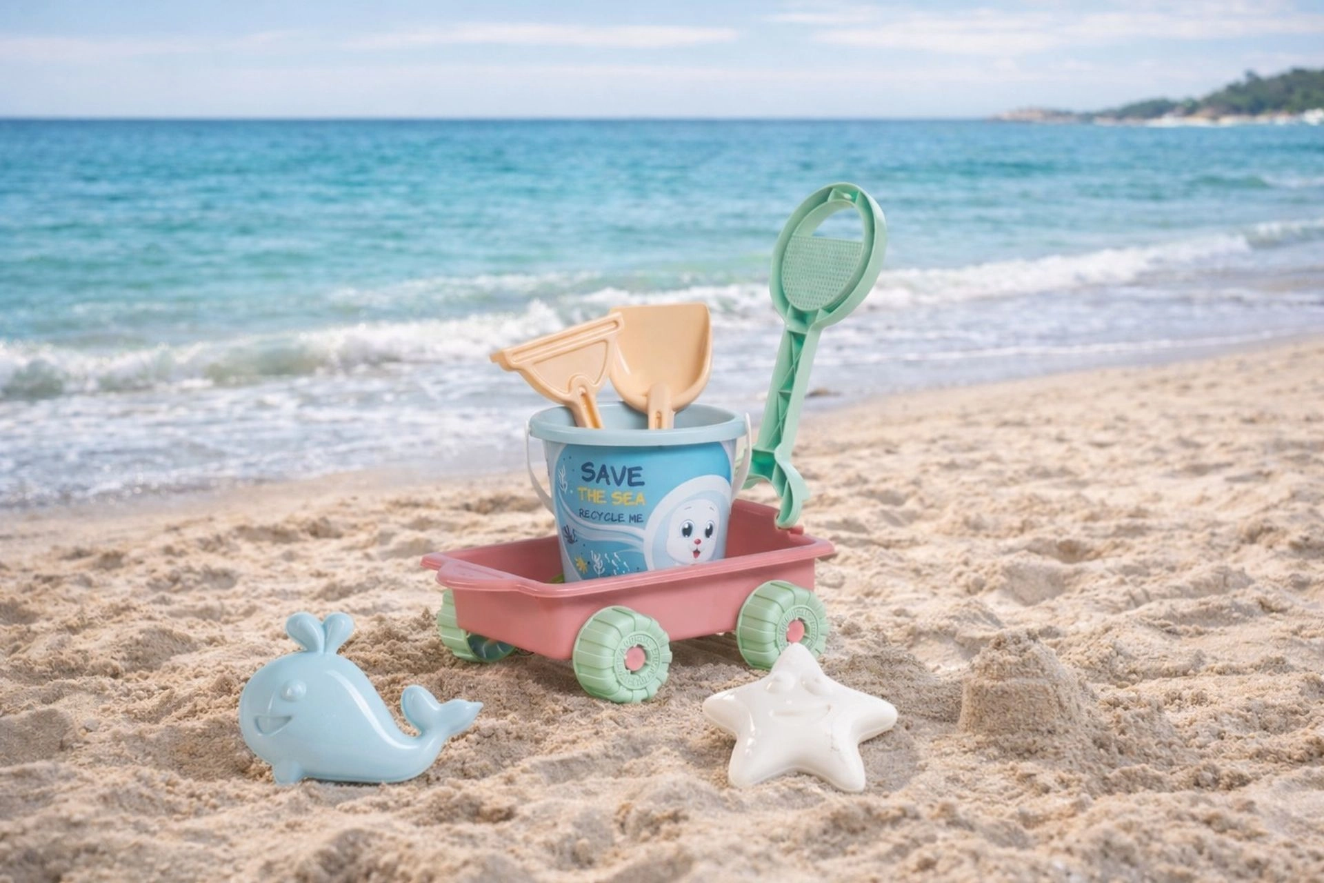 Le seau, la pelle, le râteau et deux moules (poisson et étoile de mer) stimulent l’imagination et la motricité fine. Le tout dans de jolies couleurs pastel assorties.