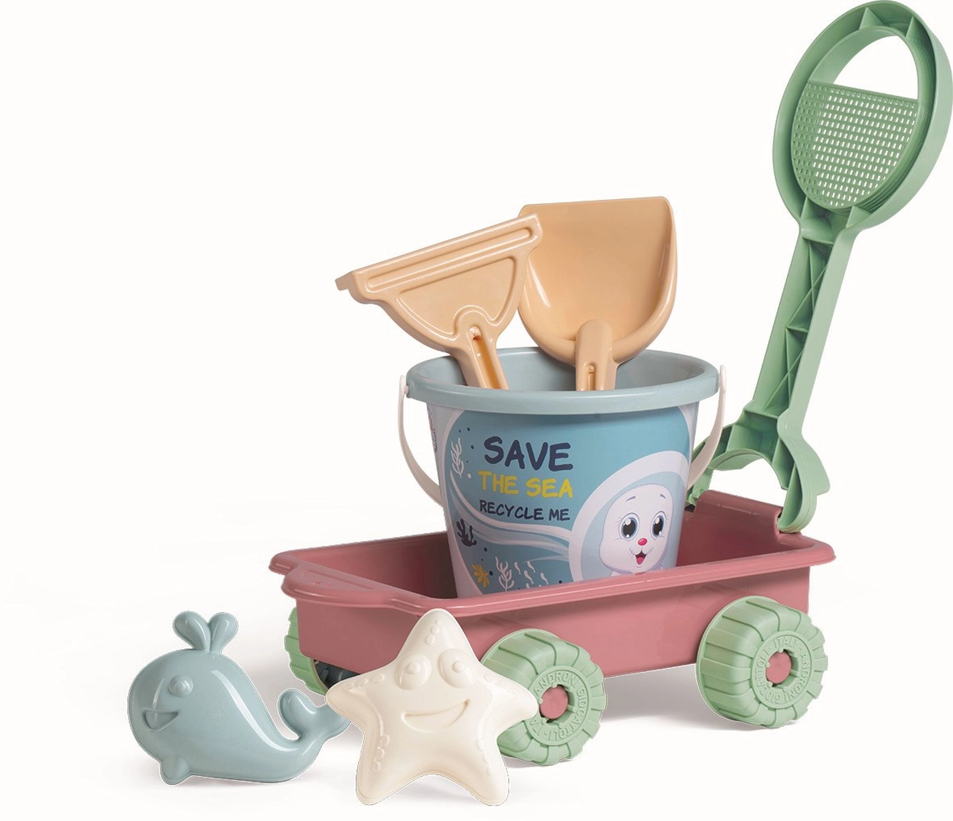 Profitez du jeu sur la plage ou au bac à sable avec ce set pastel pour le sable avec chariot. Il comprend 6 pièces en plastique de qualité fabriqué en Italie : un chariot avec tamis amovible intégré dans la poignée, un seau, une pelle, un râteau et des moules poisson et étoile de mer. Idéal pour les petits explorateurs dès 10 mois.