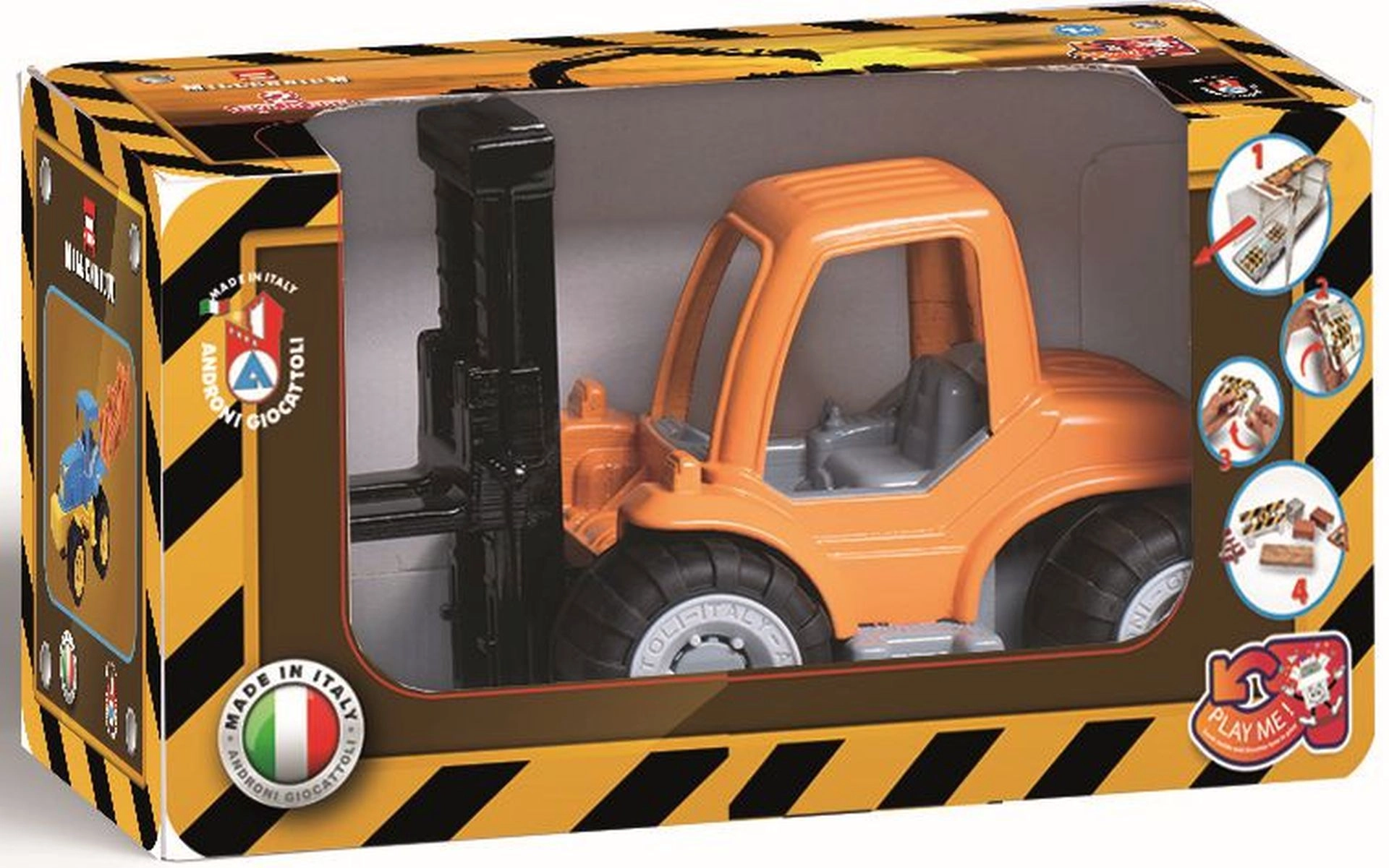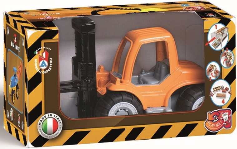 Solide chariot élévateur en plastique de la gamme Millennium de la marque Androni, qui ravira les petits bâtisseurs dès 10 mois. Il dispose d’une fourche élévatrice mobile, de roues caoutchoutées pour plus de stabilité et est livré avec des blocs en carton pour créer des scénarios de jeu. Fabriqué en Italie à partir de plastiques de qualité.