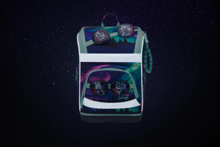 Le design aurore polaire avec éléments réfléchissants améliore la visibilité. Des badges interchangeables permettent d’harmoniser le look avec l’humeur et les centres d’intérêt de l’enfant.