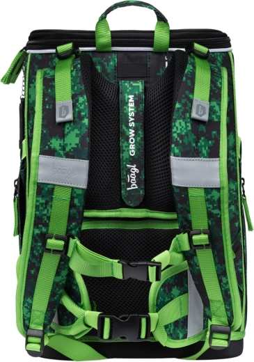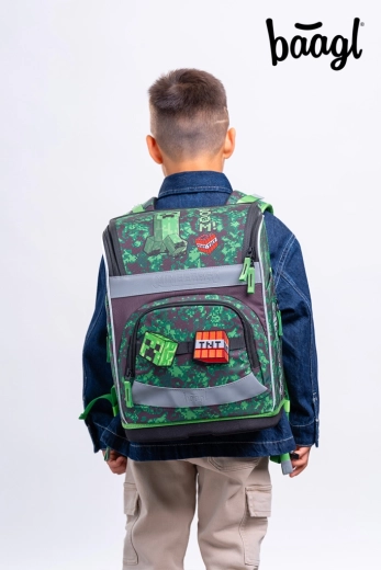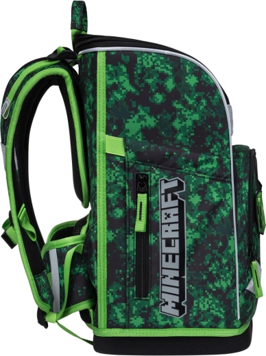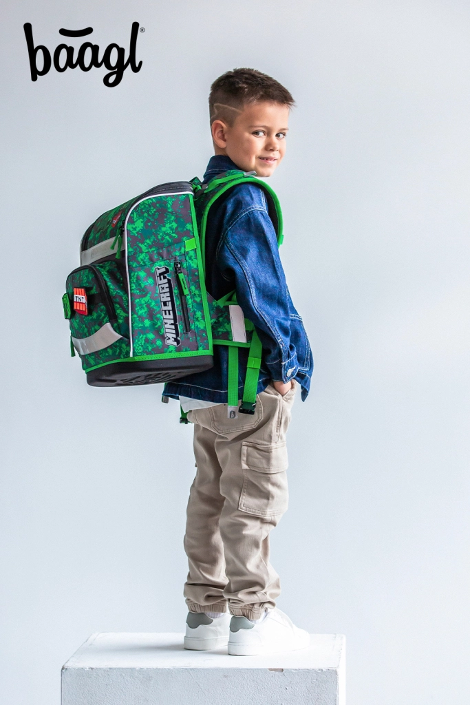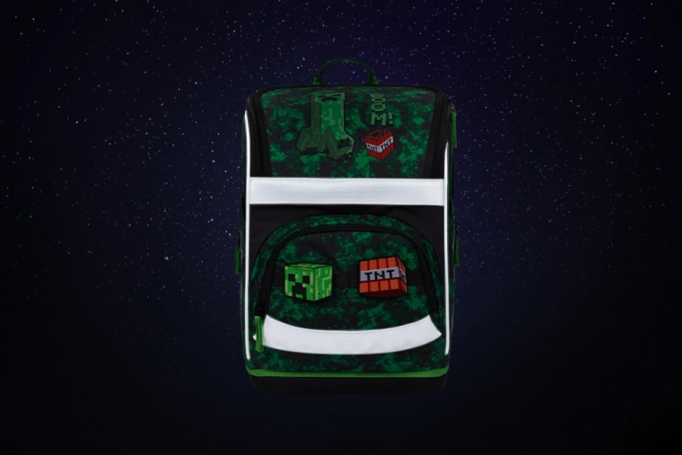 L’ensemble est décoré de motifs de jeu MINECRAFT avec camouflage en pixels et éléments réfléchissants pour une meilleure visibilité. Les fermetures YKK assurent une longue durée de vie et une ouverture/fermeture fluide, tandis que les matériaux recyclés et déperlants résistent aux exigences de l’école.
