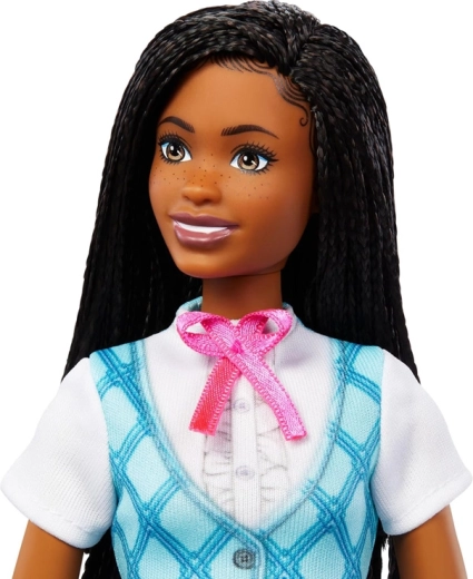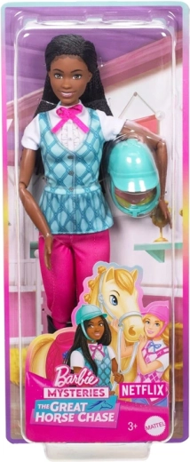 La poupée Barbie Brooklyn arbore un look d’équitation moderne : chemise blanche à motif argyle, gilet turquoise, culottes d’équitation roses et hautes bottes noires. Un casque amovible bleu clair est inclus, rendant les balades et les courses encore plus réalistes. Les tresses détaillées et les traits délicats du visage soulignent l’allure premium.