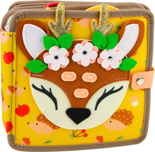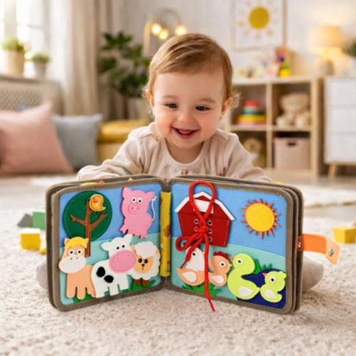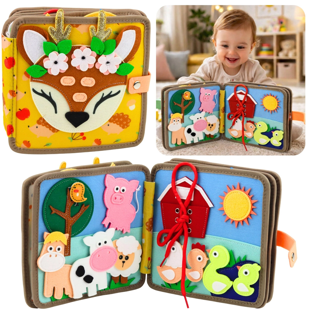 Un livre sensoriel coloré en feutrine douce, avec un motif de faon et d’animaux, offre un apprentissage ludique aux enfants. Il stimule la motricité fine, la coordination œil–main, la reconnaissance des couleurs et des formes ainsi que l’imagination. Des éléments interactifs comme le déplacement de formes, les passants et le laçage maintiennent l’attention et encouragent l’exploration.