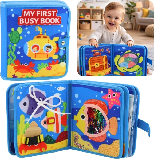 Ce livre sensoriel en feutre sur le thème de la mer met en scène des poissons, une tortue, un crabe et un coffre au trésor. Chaque page propose différentes activités et stimulations pour développer la coordination œil–main, la concentration et la reconnaissance des couleurs et des formes. Grâce à sa douceur, il est idéal pour les tout-petits et les enfants d’âge préscolaire.