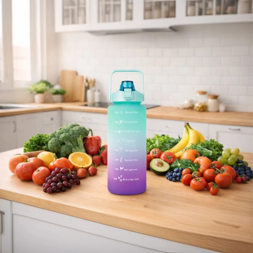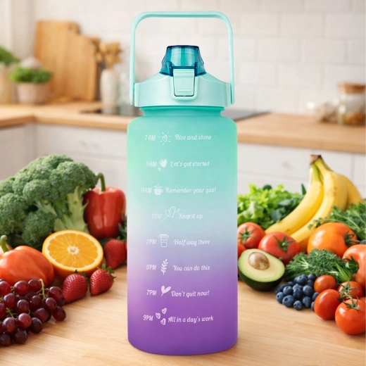 La bouteille d’eau motivationnelle de 2 L à grande capacité vous aide à suivre facilement votre apport quotidien en liquides. Le corps de la bouteille affiche des repères horaires clairs avec des slogans motivants qui vous guident du matin au soir. Le bouchon à clapet pratique avec paille permet de boire rapidement sans renverser, et la sécurité de verrouillage protège contre une ouverture accidentelle dans le sac.