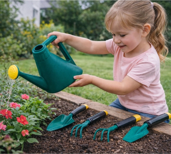 La caisse de transport pratique garde tout au même endroit – les enfants peuvent emporter leurs outils partout au jardin et ranger rapidement après le jeu. Jardiner ensemble renforce le sens des responsabilités et le lien avec la nature.