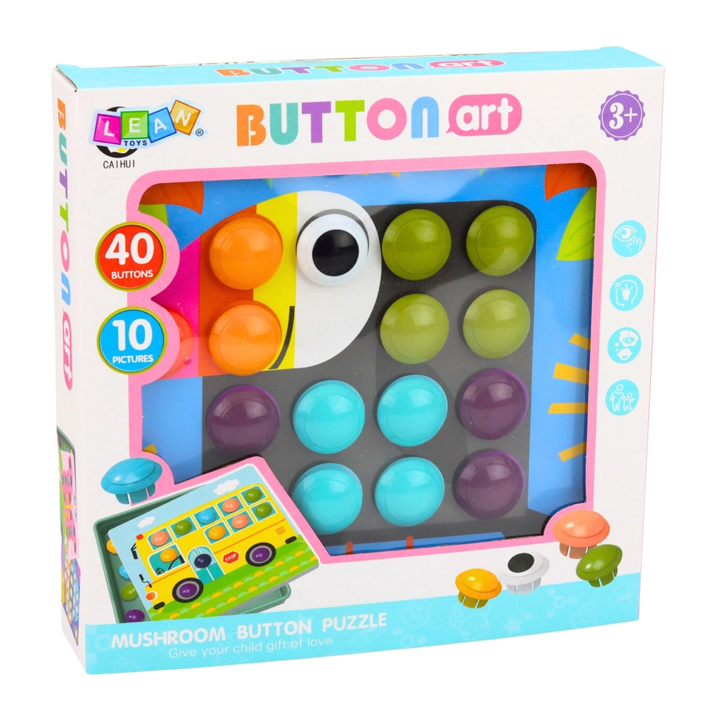 La mosaïque colorée à champignons pour enfants dès 3 ans développe la motricité fine, la coordination œil-main et la reconnaissance des couleurs. Elle comprend 40 gros boutons, 10 modèles et une base en forme de plateau pratique pour un rangement facile. Les enfants peuvent suivre les images ou créer leurs propres compositions créatives.