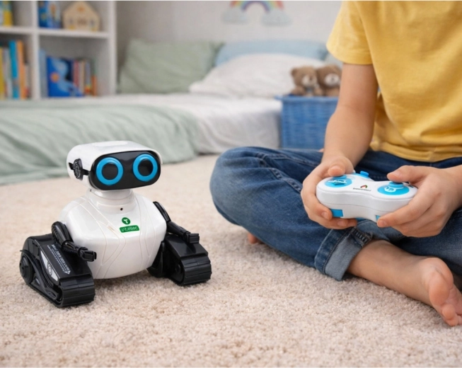 Découvrez un jouet malin qui allie technologie et divertissement. Ce robot interactif à châssis à chenilles se déplace aisément sur parquet, stratifié et moquette. Grâce à sa télécommande intuitive, l’enfant définit facilement la direction, lance la musique, les effets sonores et le mode danse. De lumineux yeux LED bleus apportent un look futuriste et intensifient l’expérience de jeu.