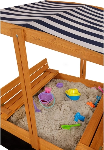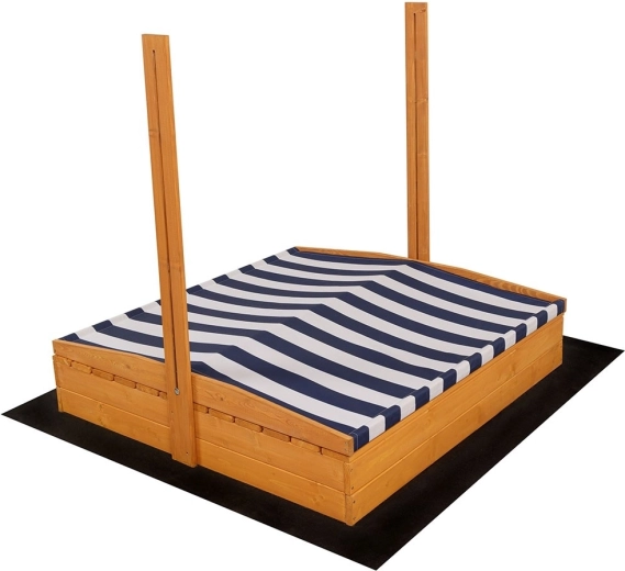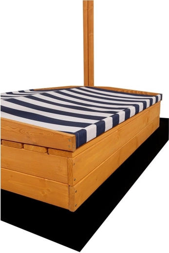 L’auvent rayé bleu‑blanc est réglable en hauteur et en inclinaison, protège les enfants du soleil et, après le jeu, couvre toute la surface du bac à sable contre la pluie et les saletés.