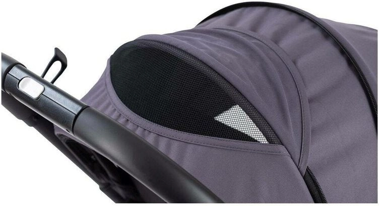La capote réglable avec lucarne permet de garder un œil sur l’enfant et offre une protection contre le soleil, tandis que le panneau de ventilation améliore la circulation de l’air.