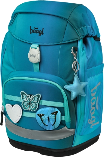Cartable scolaire léger et ergonomique BAAGL Airy Plus Butterfly pour enfants dès la 1re classe, doté d’un système dorsal évolutif Grow, d’un poids inférieur à 1,2 kg, d’un fond rigide et d’éléments réfléchissants pour une sécurité accrue. Fabriqué en matériau recyclé et déperlant certifié GRS, il dispose d’une poche isotherme pour le goûter, d’un agencement intelligent et d’une fermeture magnétique du rabat pour une manipulation facile.