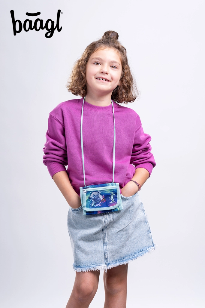 Portefeuille tour de cou BAAGL au motif Aurora offrant un rangement sécurisé pour la petite monnaie, les cartes et les clés, et un port confortable grâce à une cordon réglable avec système de sécurité. Fabriqué en matériau recyclé résistant certifié GRS, il dispose d’une fermeture à velcro, d’une pochette séparée pour la monnaie et d’une étiquette nominative pratique pour une identification facile.