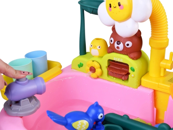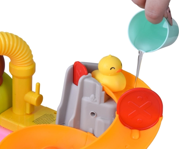 Le tuyau flexible avec douchette fleur transforme la table en mini parc aquatique. Les enfants peuvent asperger l’eau, faire tourner les roues et rincer les jouets.