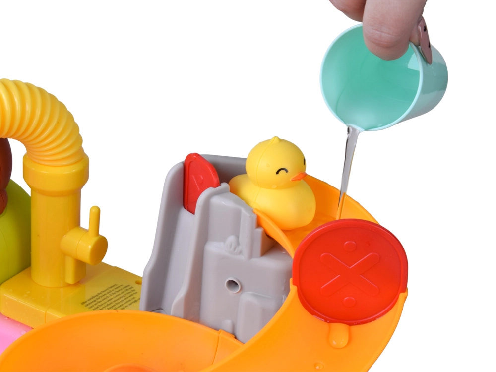 Cette table d’eau interactive offre de multiples possibilités de jeu aquatique : verser, asperger, pêcher et faire naviguer des bateaux. L’accessoire douchette en forme de fleur ajoute un effet aquatique réaliste et les canaux ludiques ainsi que les roues montrent comment l’eau met les éléments en mouvement.