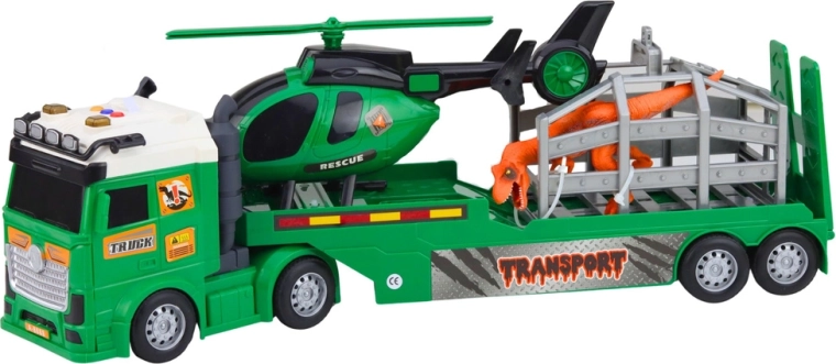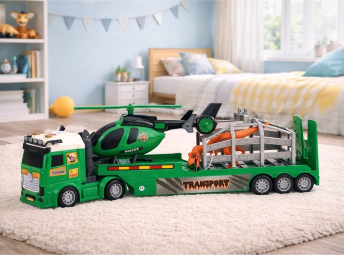 Ce set de transport élaboré, en vert avec marquages TRANSPORT et RESCUE, est idéal pour les petits fans de créatures préhistoriques et de missions de secours. Le grand tracteur avec remorque transporte à la fois la cage avec dinosaure et l’hélicoptère de secours, permettant aux enfants de planifier des opérations de sauvetage, des captures et des transports spéciaux.
