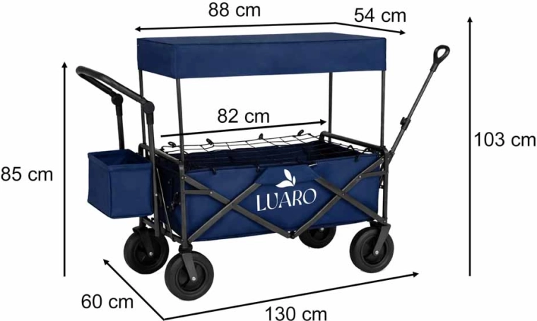 Avec le chariot LUARO, vous obtenez un assistant fiable pour les sorties en famille, les journées à la plage et le camping. Le cadre en acier robuste et le tissu Oxford 600D durable garantissent stabilité et longue durée de vie, tandis que les grandes roues tout-terrain franchissent sable, herbe et pavés. Vous pouvez tirer ou pousser le chariot, et grâce aux poignées réglables en hauteur, il s’adapte confortablement à votre taille.