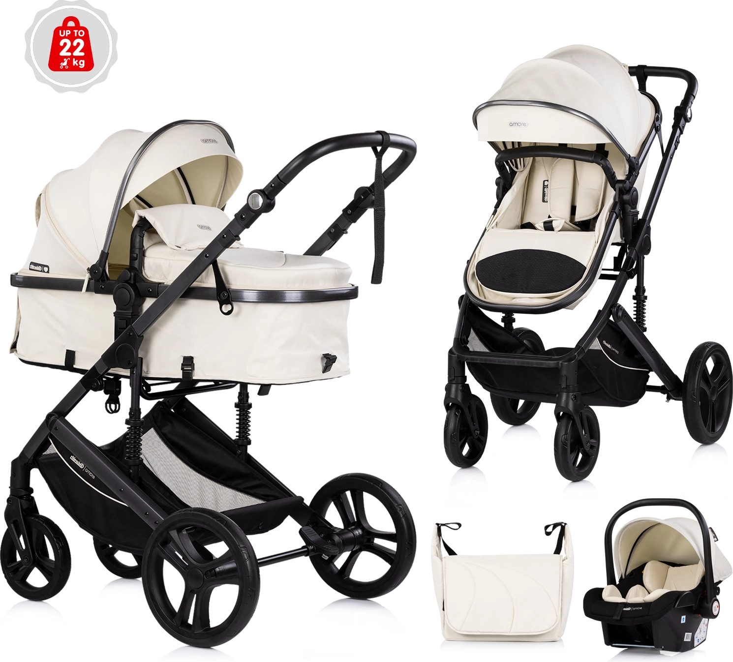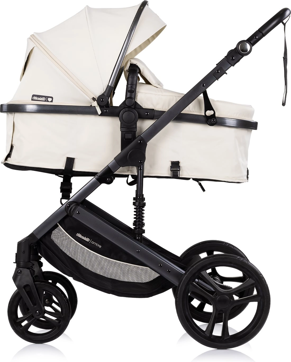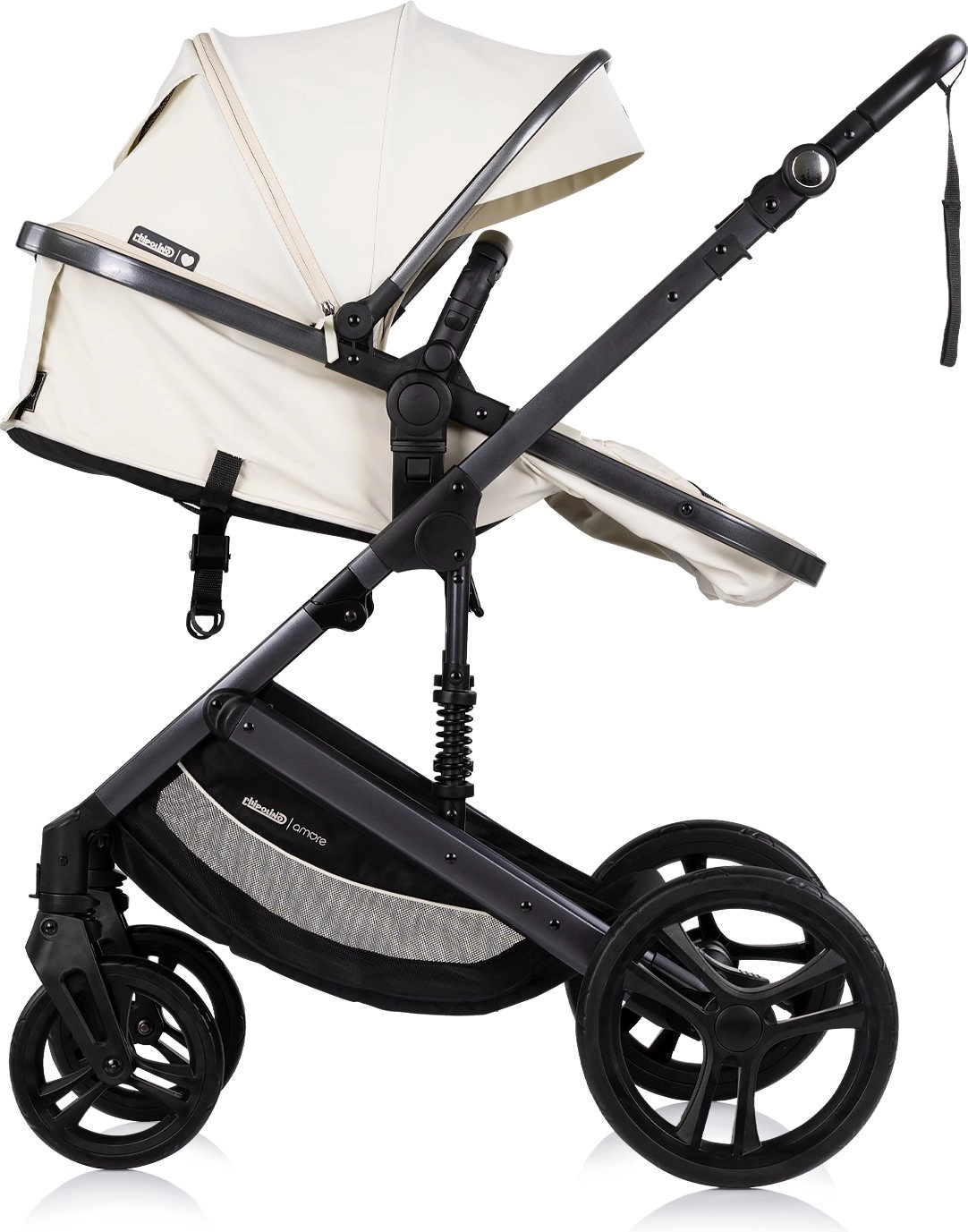 Chipolino Amore 2 en 1 en teinte Cashmere est une poussette polyvalente que vous passez aisément de la version sportive à la nacelle pour nouveau-né. Grâce à son châssis suspendu et à ses grandes roues tout-terrain, elle offre une conduite douce et confortable en ville comme sur des chemins plus légers. La capote réglable avec pare-soleil protège l’enfant, tandis que le harnais 5 points rembourré et l’arceau amovible renforcent la sécurité.