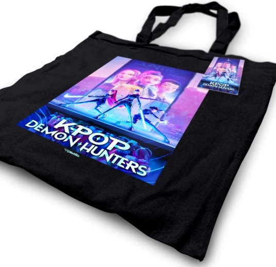 Affichez votre passion pour K-pop Demon Hunters avec ce sac pratique et durable en toile noire. L’avant est orné d’une illustration des personnages principaux aux couleurs vives, dans une pose dynamique avec des accents néon bleu et violet, apportant une touche moderne qui attire immédiatement l’attention.