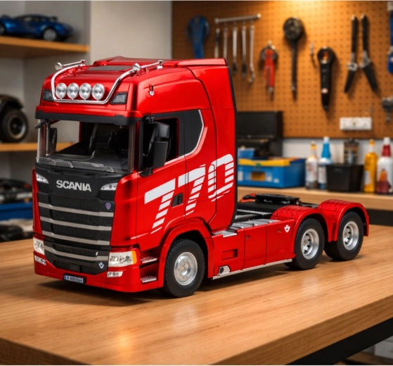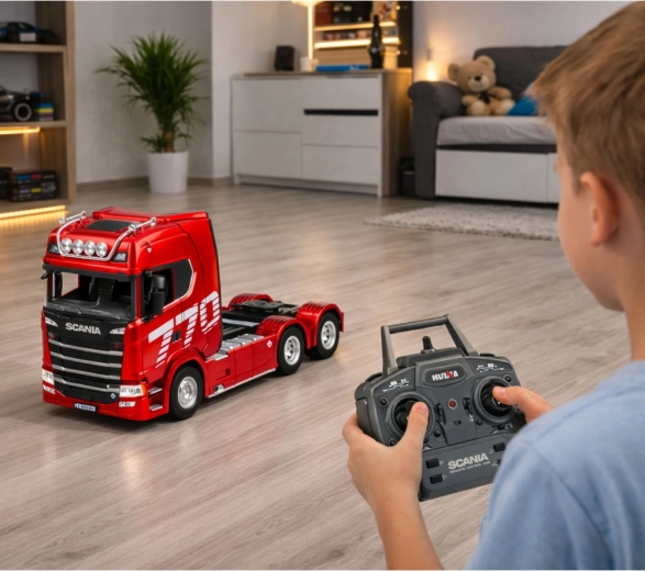 Modèle réaliste de tracteur SCANIA radiocommandé de la marque Huina à l’échelle 1:18, offrant un niveau de détail élevé, des effets lumineux et sonores et une construction robuste en plastique de qualité. Avec une portée de commande allant jusqu’à 25 m, une batterie 7,4 V 1200 mAh et une autonomie d’environ 15 minutes, il est idéal pour s’amuser à la maison comme en extérieur.