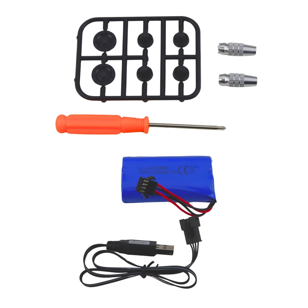 La boîte comprend une batterie 7,4 V 1200 mAh, un câble de charge USB et des accessoires – il suffit d’insérer des piles AA dans la télécommande et c’est parti.