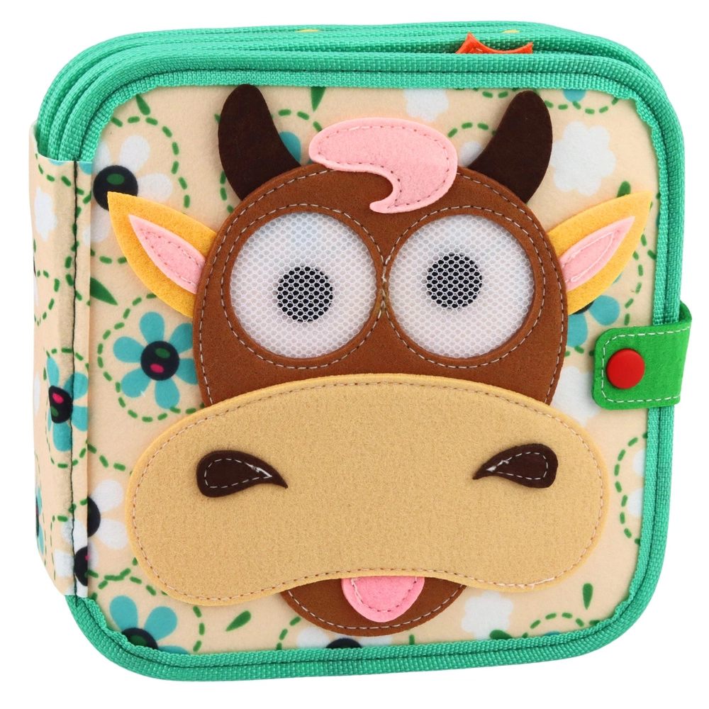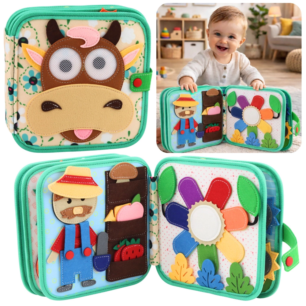 Ce mignon « quiet book » avec une vache sur la couverture offre aux enfants un environnement de jeu et d’apprentissage sûr et stimulant. Chaque page propose des activités différentes – placer et déplacer des pièces en feutrine, reconnaître les couleurs, les formes et les animaux de la ferme – ce qui développe naturellement la coordination œil–main, la concentration et la pensée logique.