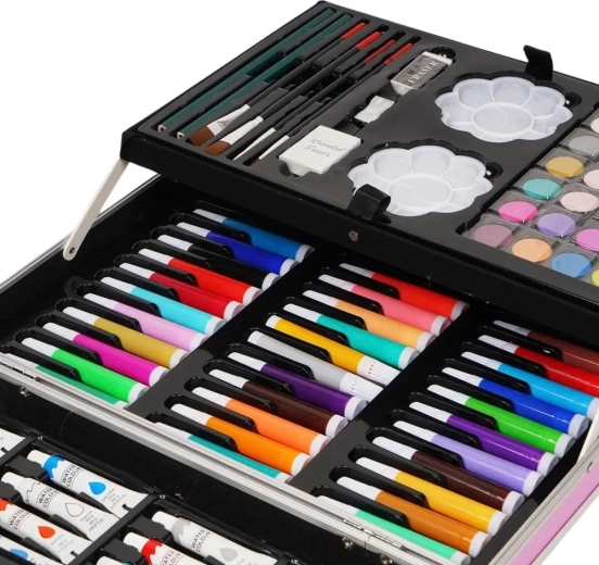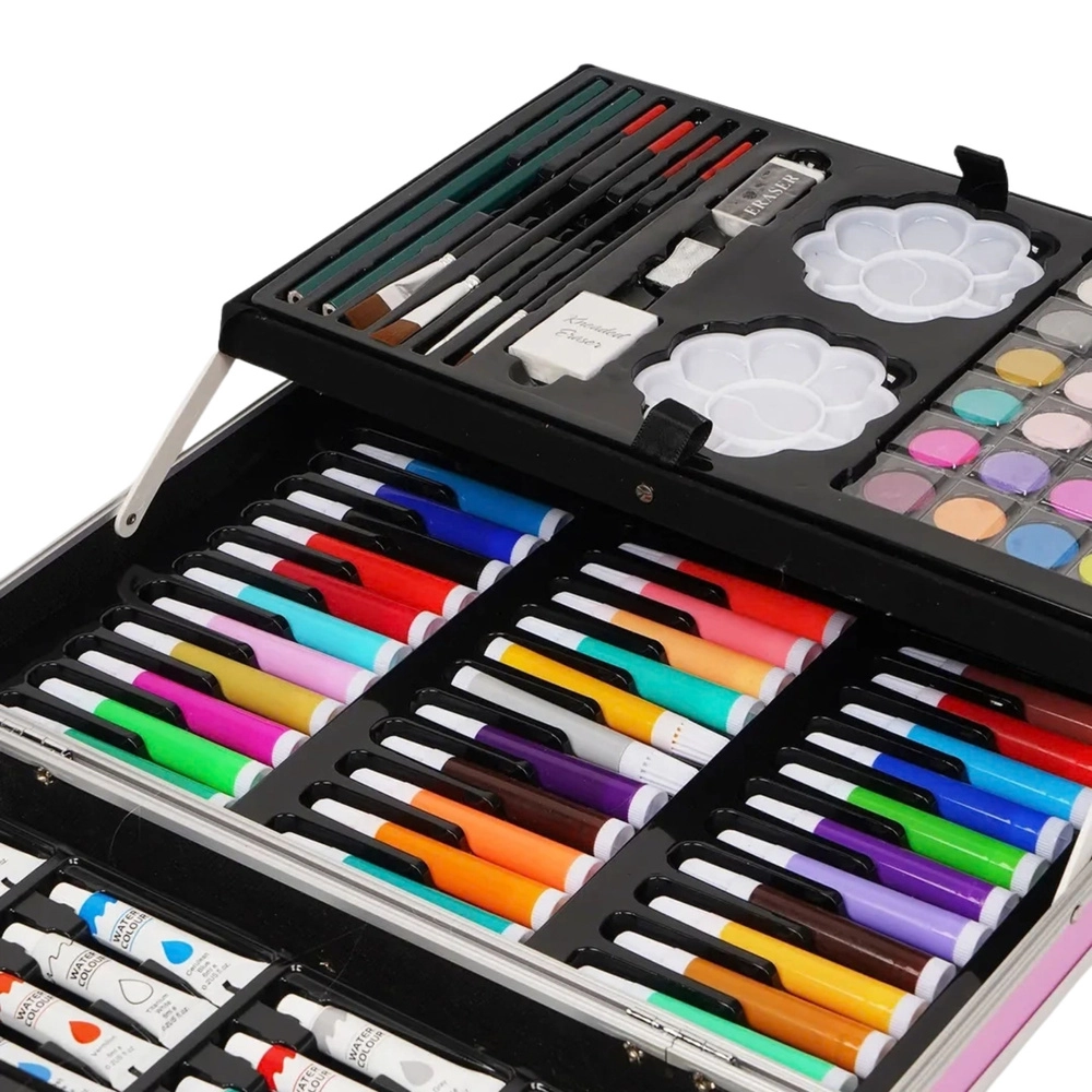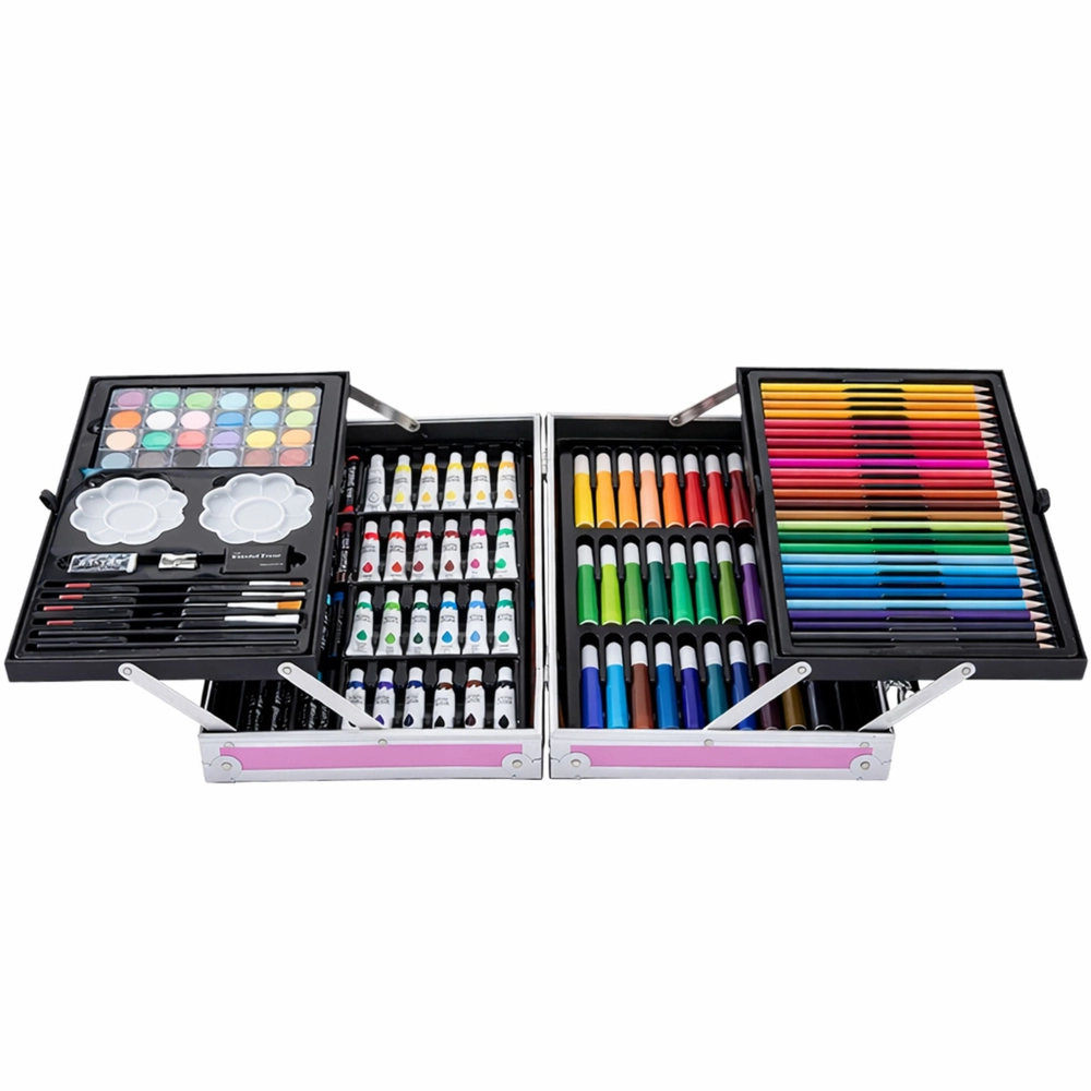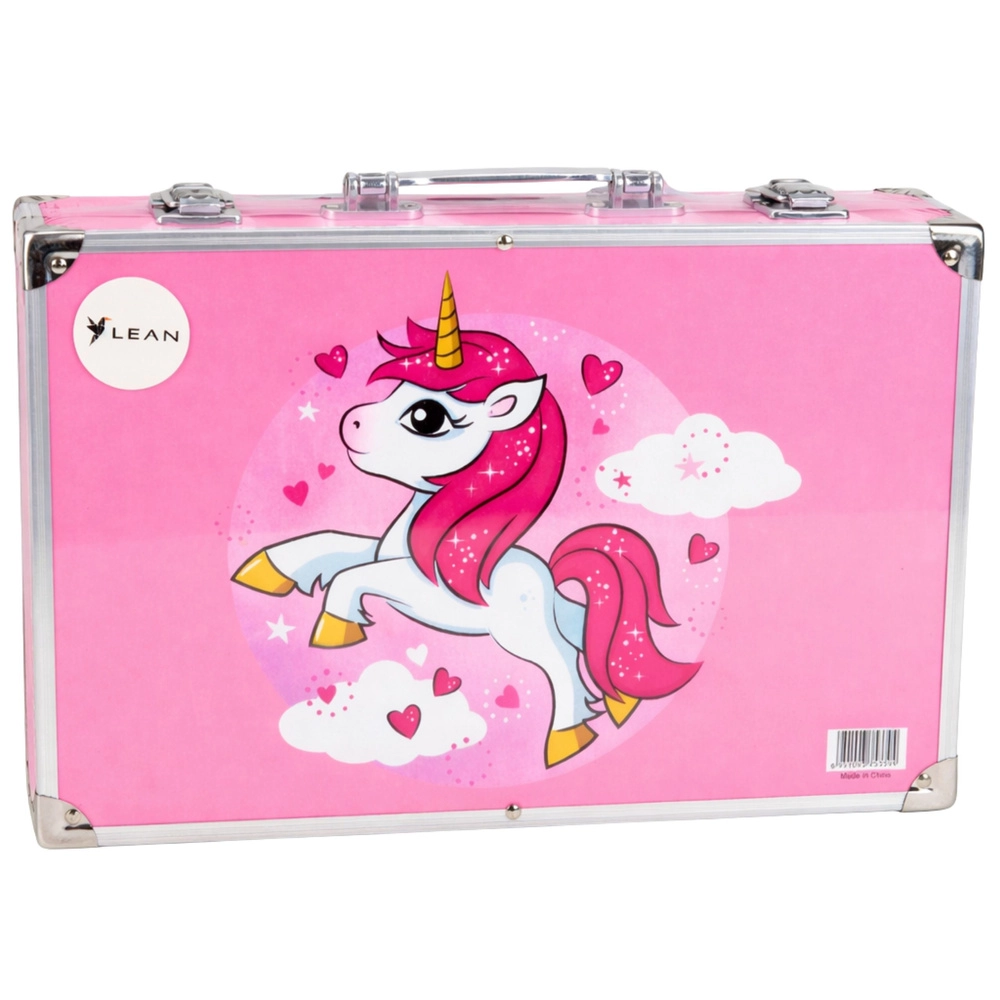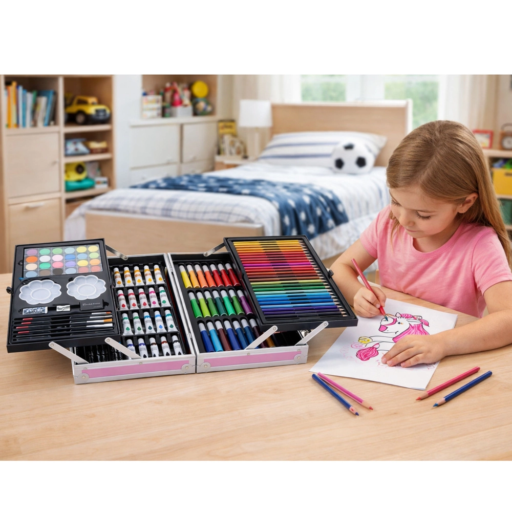 Un coffret artistique complet pour enfants dans une mallette rose à motif licorne offrant jusqu’à 150 pièces pour dessiner, peindre et créer. La mallette pratique avec fermeture solide et poignée garde tout le matériel bien organisé et prêt pour les voyages, l’école et les ateliers.