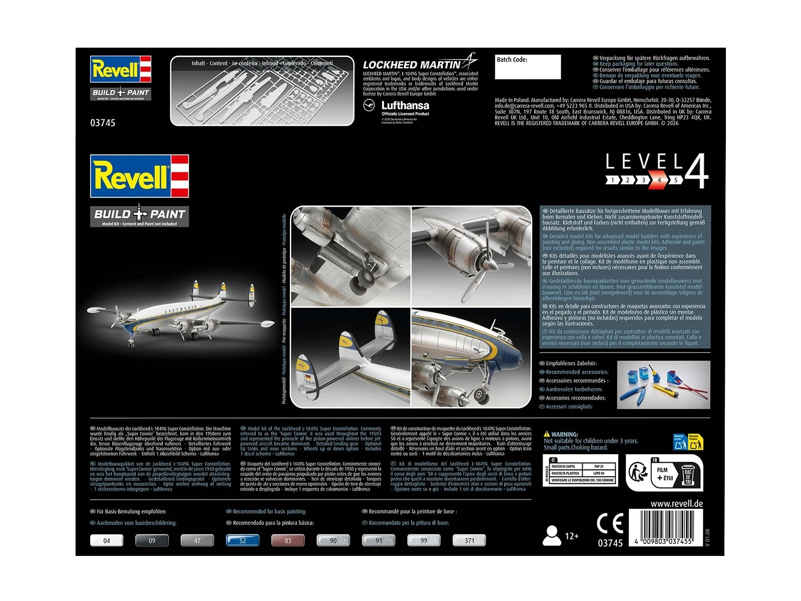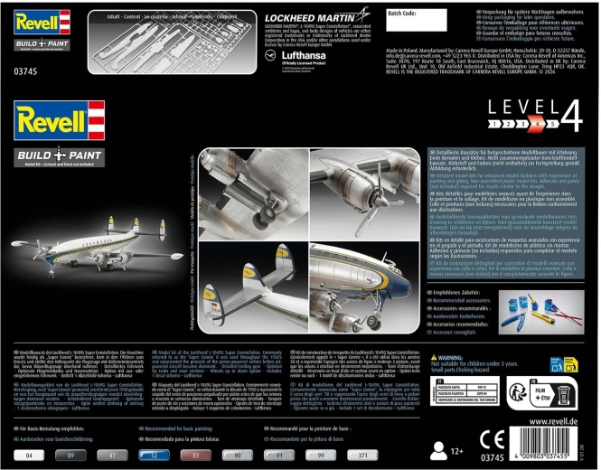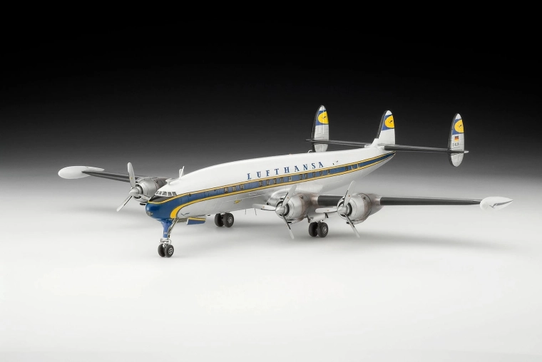 Ce modèle anniversaire célèbre le retour de la légendaire « Connie » à l’ère dorée de l’aviation. Le Lockheed L-1049G Super Constellation aux couleurs de Lufthansa, qui a volé pour la première fois pour la compagnie en 1955, vous est proposé ici en maquette fidèle et historiquement exacte à l’échelle 1:144. L’outil exclusif Revell garantit des surfaces réalistes et des lignes de fuselage nettes.