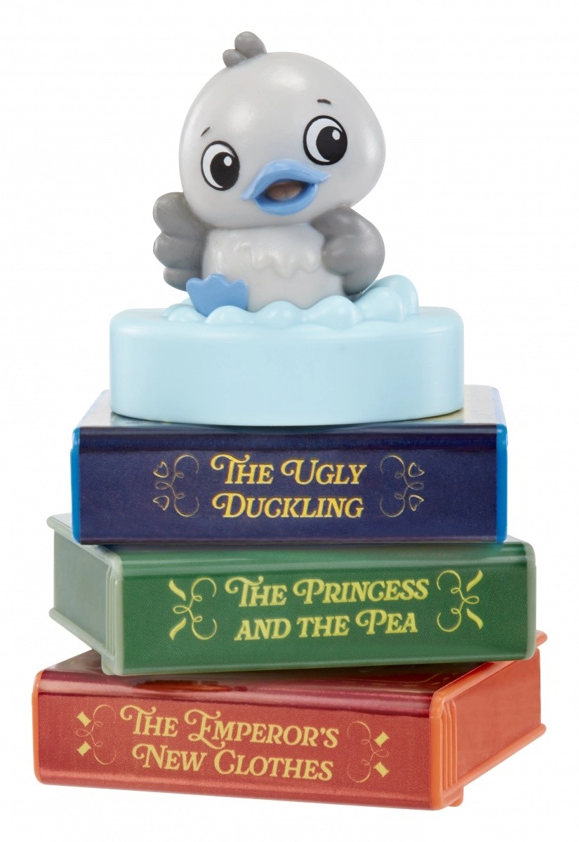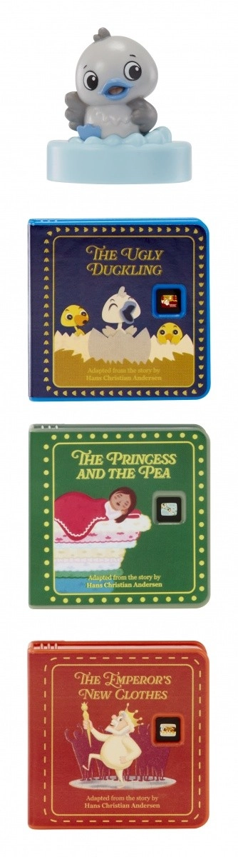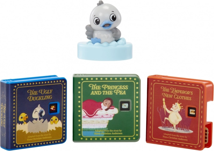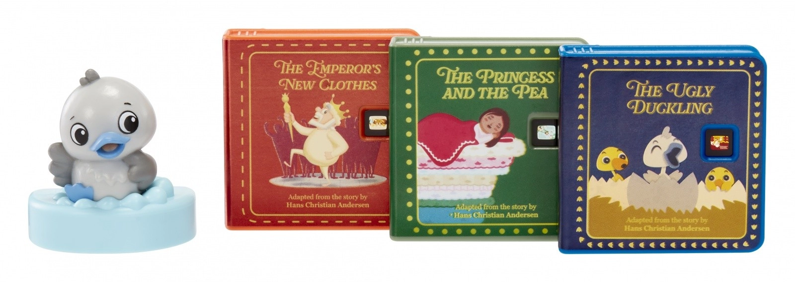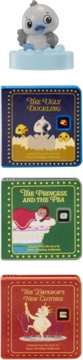 Le coffret comprend 3 contes classiques : Le Vilain Petit Canard, La Princesse au petit pois et Les Habits neufs de l’Empereur, ainsi qu’une adorable figurine de caneton du Vilain Petit Canard, qui crée des effets lumineux supplémentaires en mode veilleuse. Une bibliothèque d’histoires extensible propose d’autres titres vendus séparément. La distance de projection recommandée est de 0,6–1,8 m pour une image nette et lisible.