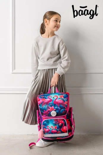 Ensemble scolaire stylé avec motif de flamants roses pour le premier cycle du primaire, comprenant un cartable ergonomique, une trousse, un sac à cordon, un tablier et un porte-monnaie à porter autour du cou. Le cartable dispose d’un système dorsal réglable, d’un dossier ergonomique, d’une fermeture magnétique Fidlock, d’éléments réfléchissants et d’une construction légère et déperlante pour un port sûr et confortable. Des poches pratiques et une organisation bien pensée assurent une parfaite visibilité de toutes les fournitures scolaires.