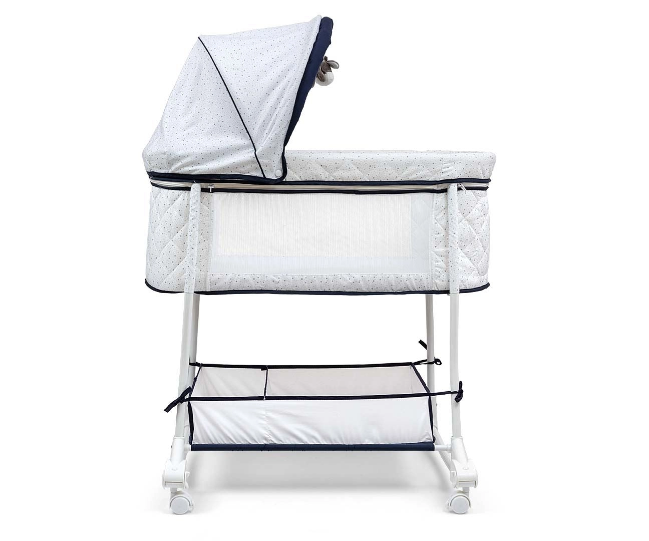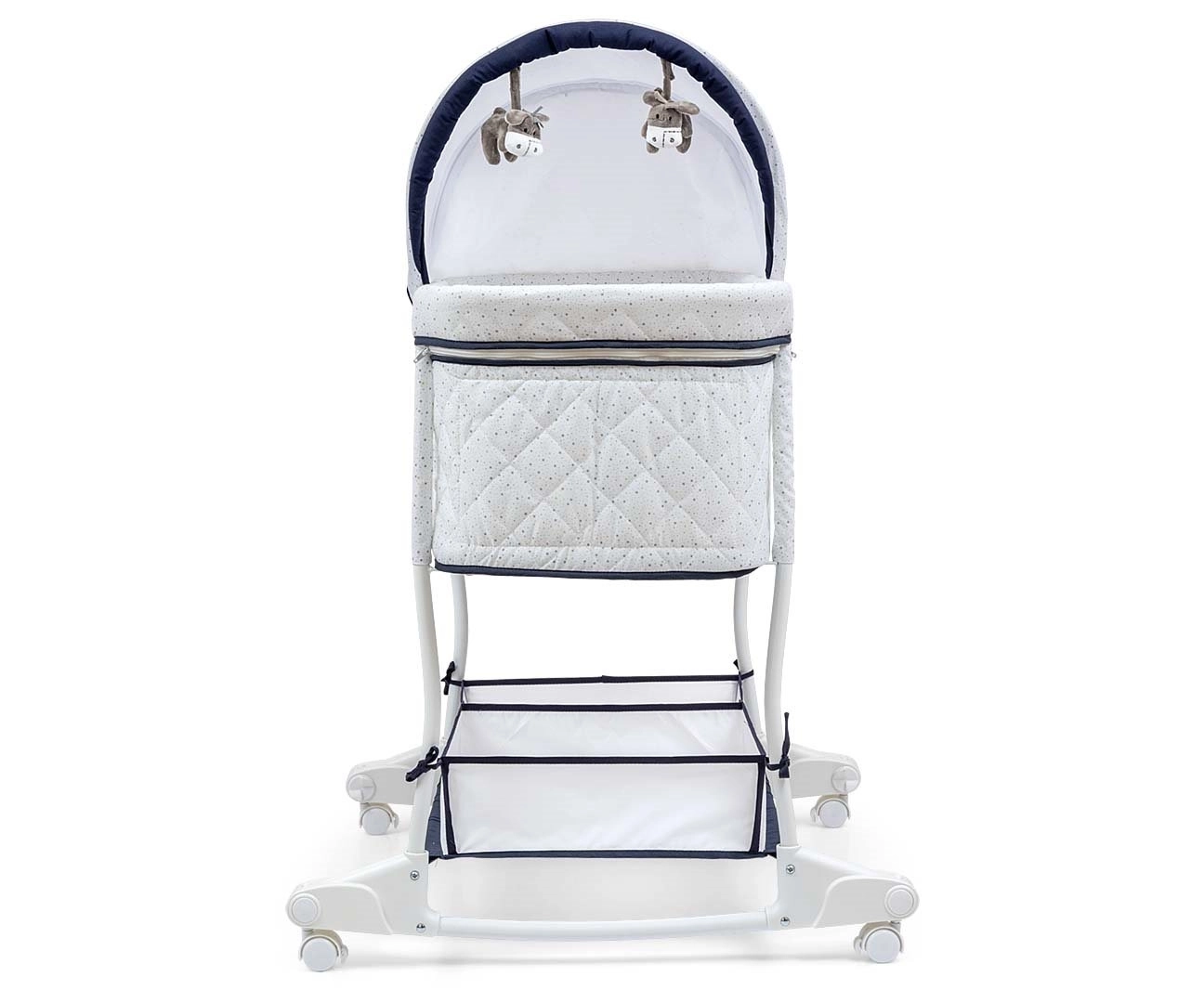 La capote amovible et rabattable avec deux peluches douces protège de la lumière et offre une stimulation visuelle. Le matelas moelleux et le garnissage intérieur matelassé offrent un maximum de confort, tandis que le panier inférieur à deux compartiments accueille toutes les affaires essentielles. Le cadre métallique, les roulettes verrouillables et les patins antidérapants apportent de la stabilité tout en facilitant les déplacements dans la maison.