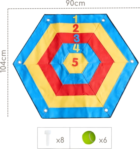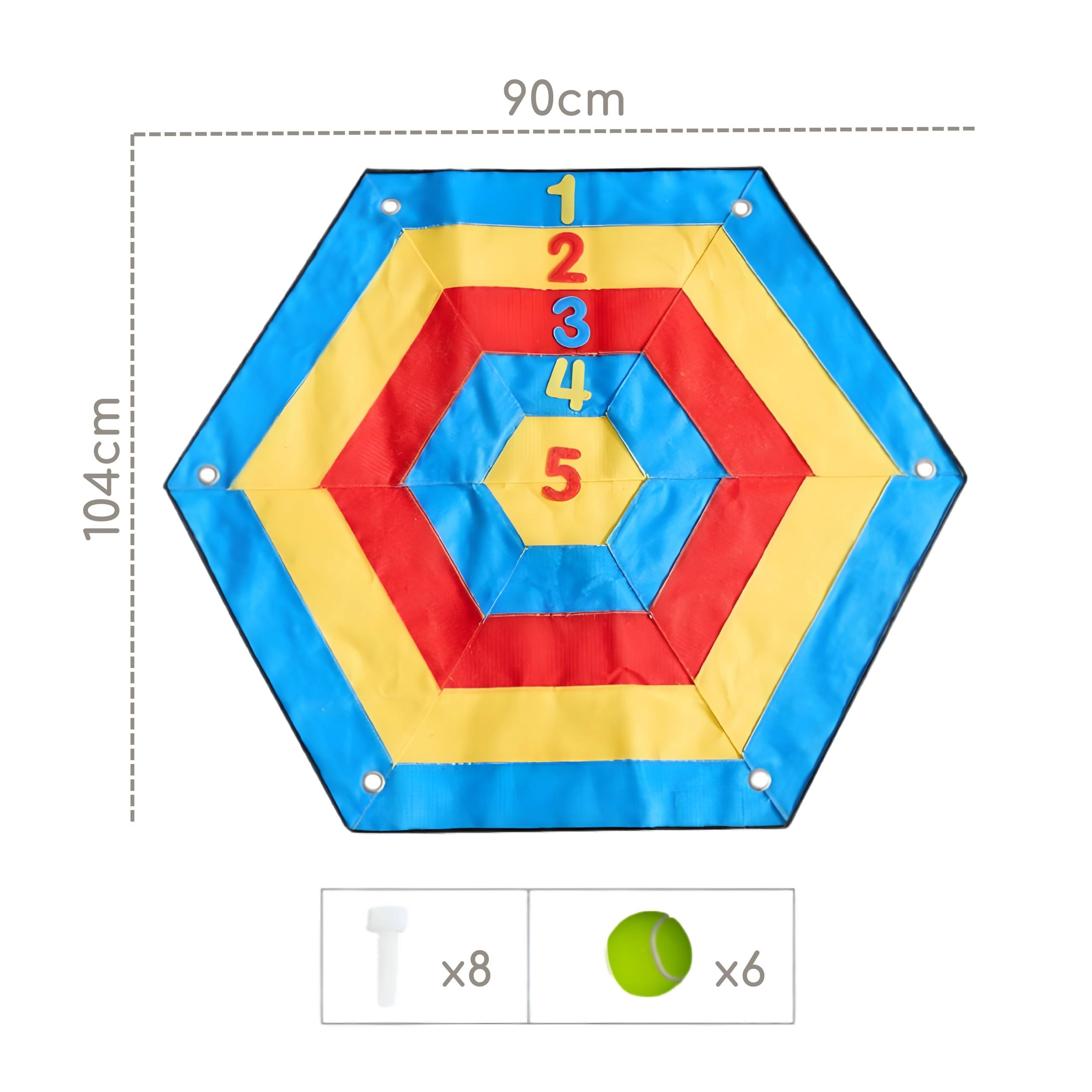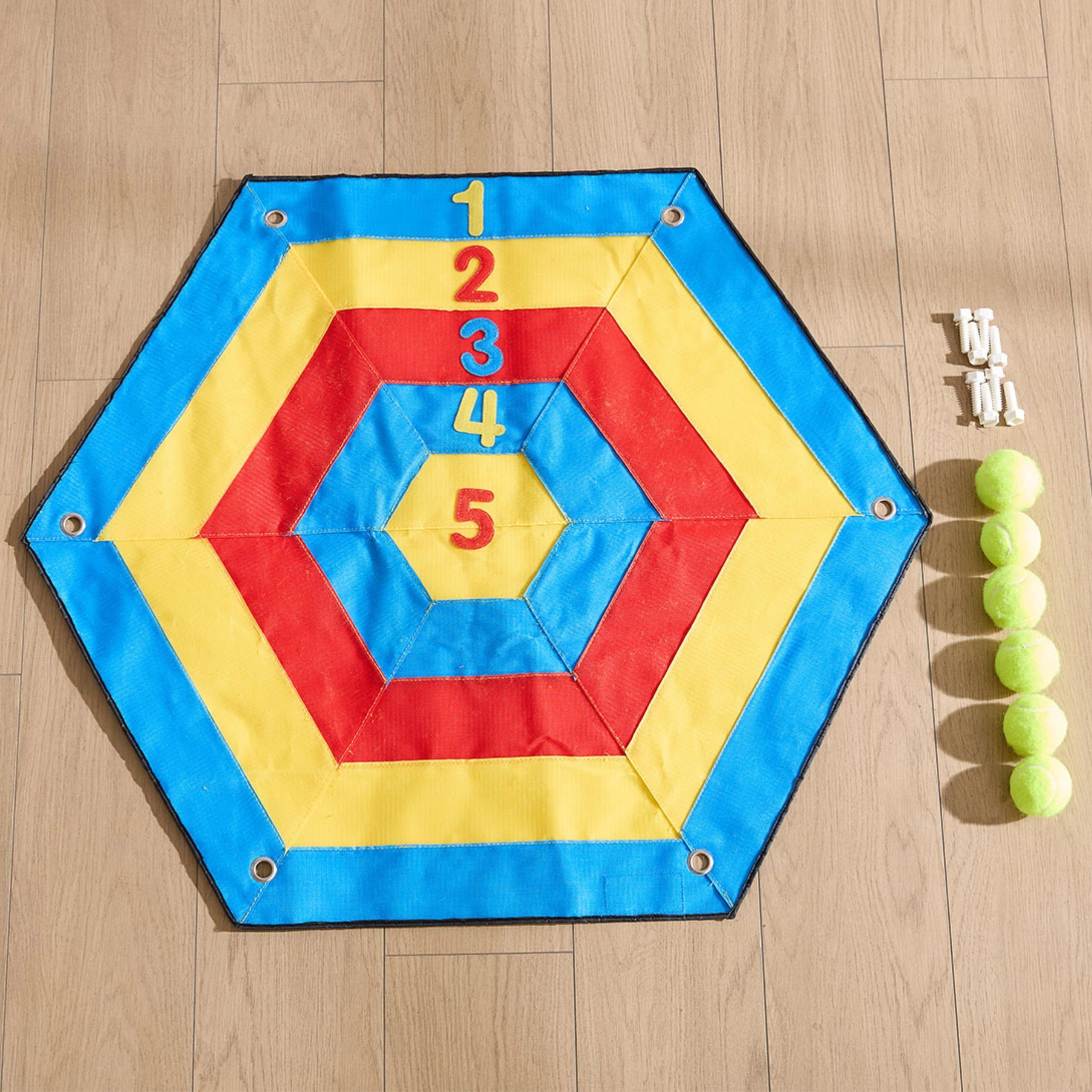 La cible hexagonale aux couleurs vives et aux zones numérotées invite au jeu et favorise la précision ainsi que la concentration.