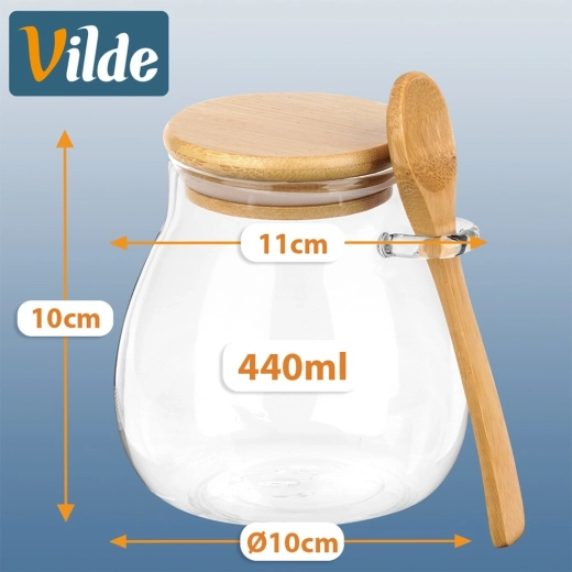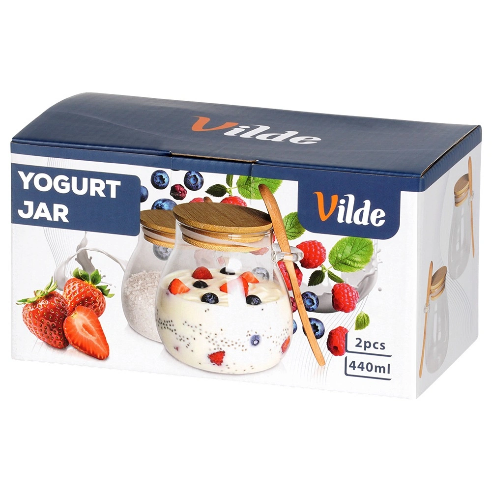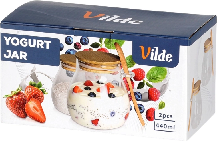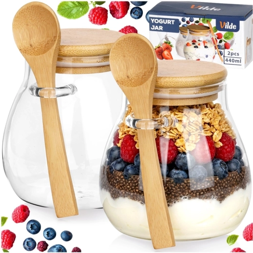 Set de deux pots en verre de 440 ml avec couvercle en bambou et cuillère intégrée, idéal pour les yaourts, desserts, confitures, miel et épices. Le couvercle hermétique garde le contenu frais plus longtemps, tandis que le porte-cuillère pratique garantit que vous l’aurez toujours à portée de main.
