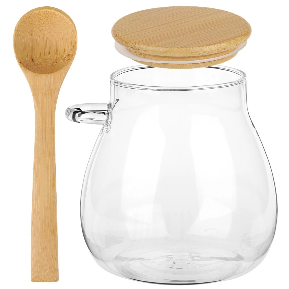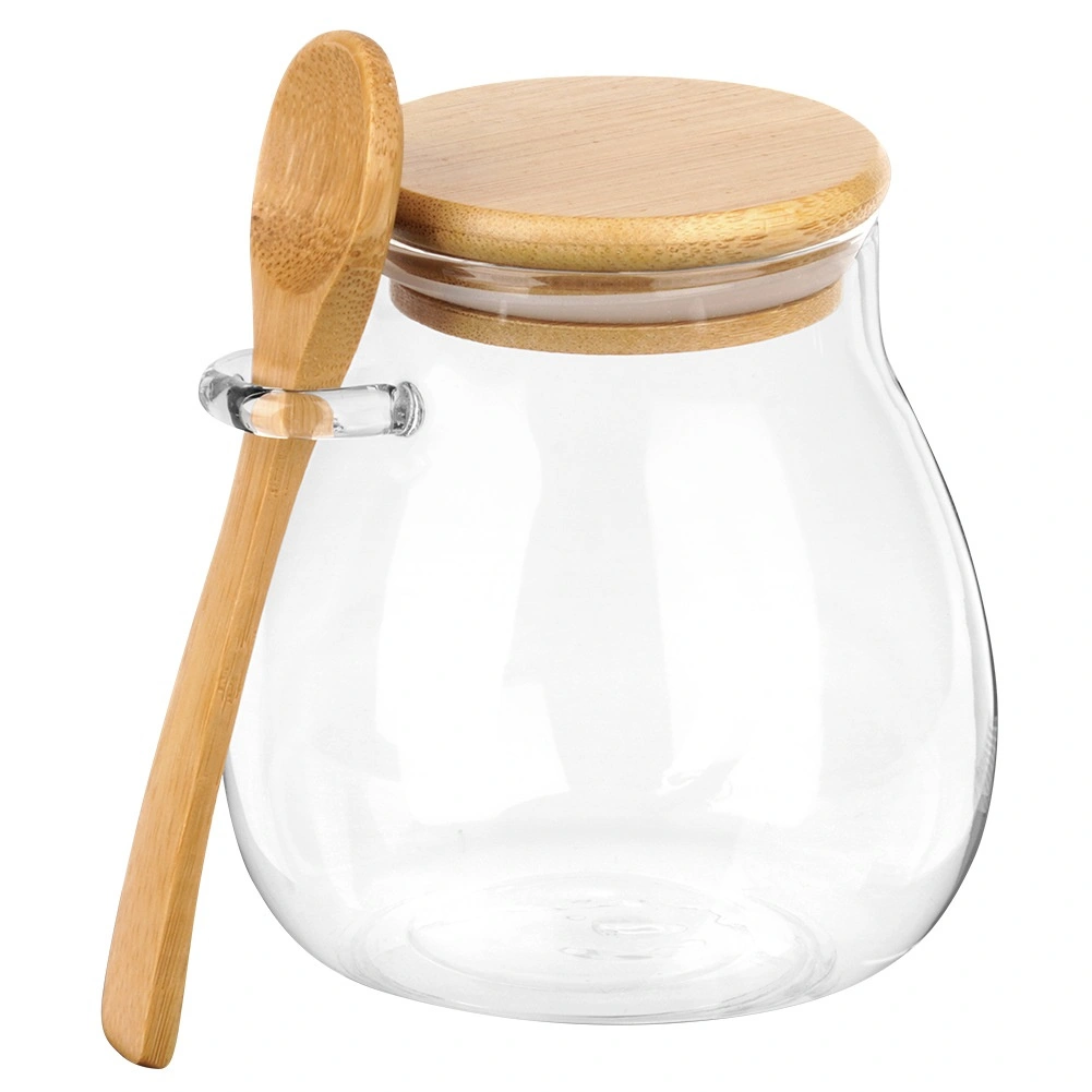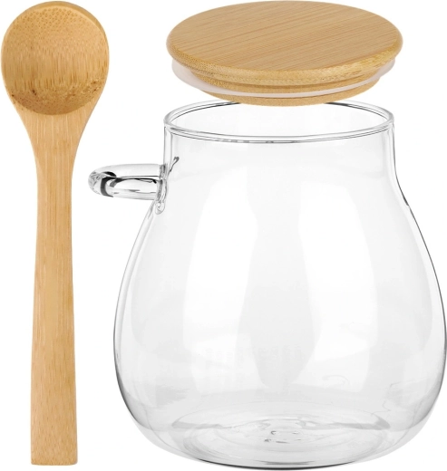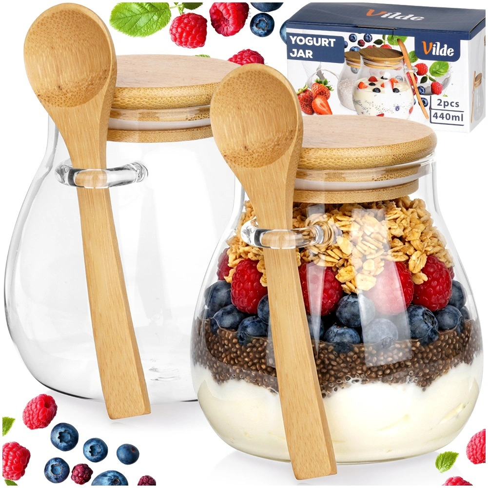 Deux pots en verre de 440 ml avec couvercles en bambou et cuillères – idéals pour servir et conserver les desserts et encas à la maison comme en déplacement.