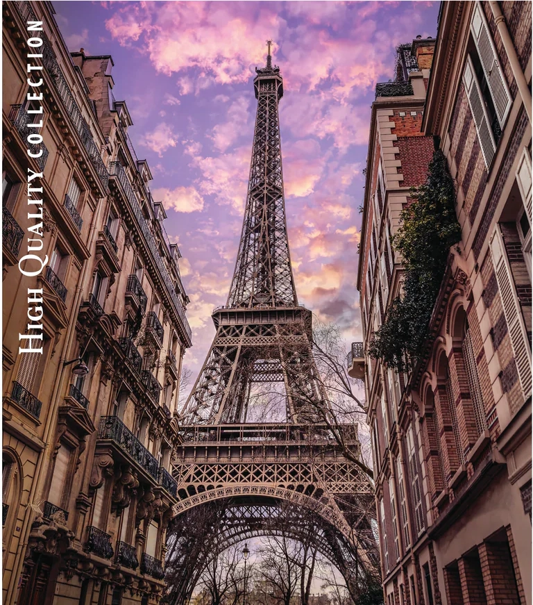 Un gros plan détaillé de la tour Eiffel entre les immeubles parisiens dans une douce lueur rose de l’aube apporte une touche d’élégance et une ambiance voyage à votre intérieur.