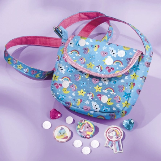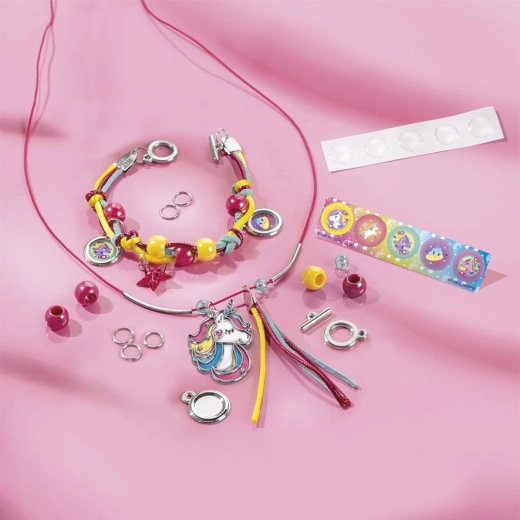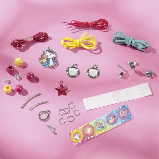 Ce kit créatif magique offre un double plaisir : création de bijoux et décoration d’un sac. Les enfants fabriquent facilement un bracelet et un collier avec des perles et un pendentif licorne, puis décorent le sac en tissu avec des boutons 3D, des autocollants à velcro et des strass en forme de cœur.