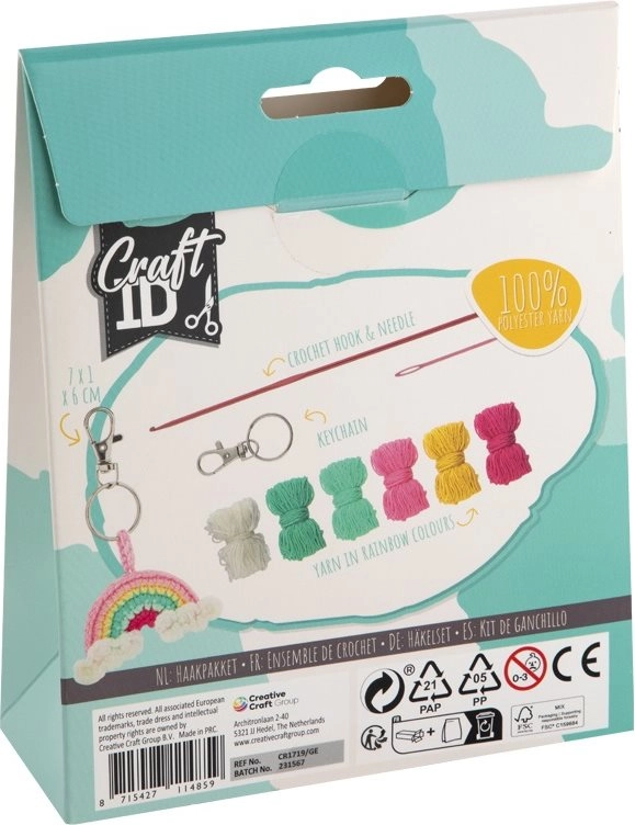 Créez votre propre porte-clés au crochet en forme d’arc-en-ciel avec ce kit pratique CRAFT ID. Idéal pour les débutants comme pour les avancés, ce porte-clés est mignon, original et parfait comme cadeau. Le coffret contient tout le nécessaire : laine, rembourrage, crochet et aiguille en plastique, pour commencer tout de suite.